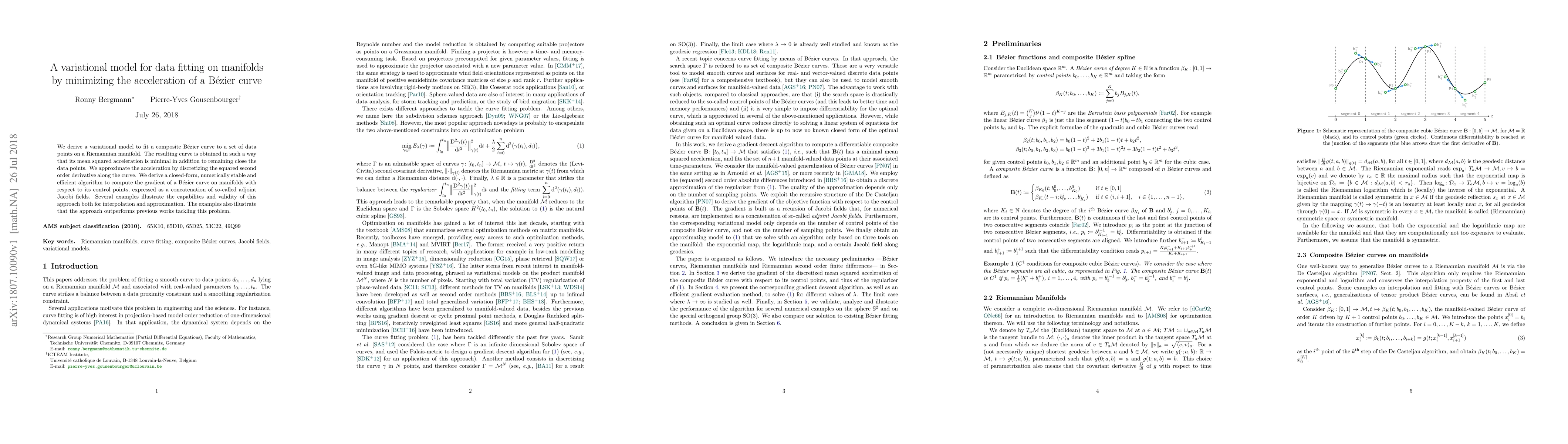 We derive a variational model to fit a composite B\'ezier curve to a set of data points on a Riemannian manifold. The resulting curve is obtained in such a way that its mean squared acceleration is minimal in addition to remaining close the data points. We approximate the acceleration by discretizing the squared second order derivative along the curve. We derive a closed-form, numerically stable and efficient algorithm to compute the gradient of a B\'ezier curve on manifolds with respect to its control points, expressed as a concatenation of so-called adjoint Jacobi fields. Several examples illustrate the capabilites and validity of this approach both for interpolation and approximation. The examples also illustrate that the approach outperforms previous works tackling this problem.