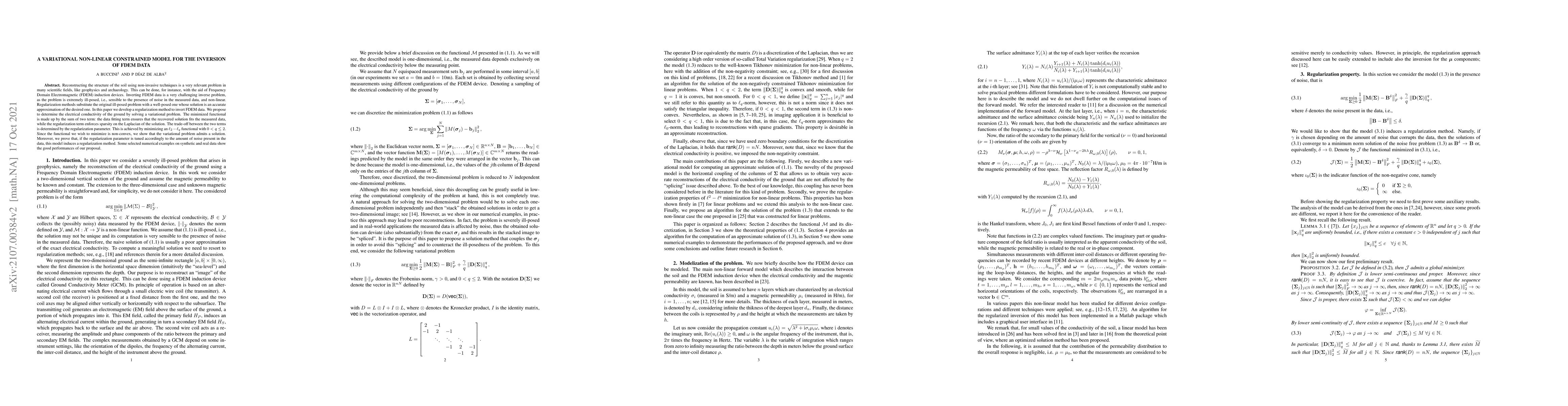 The paper presents a novel variational non-linear constrained model for FDEM data inversion, along with a proof of existence for the minimization problem's solution and an iterative algorithm for its computation.
