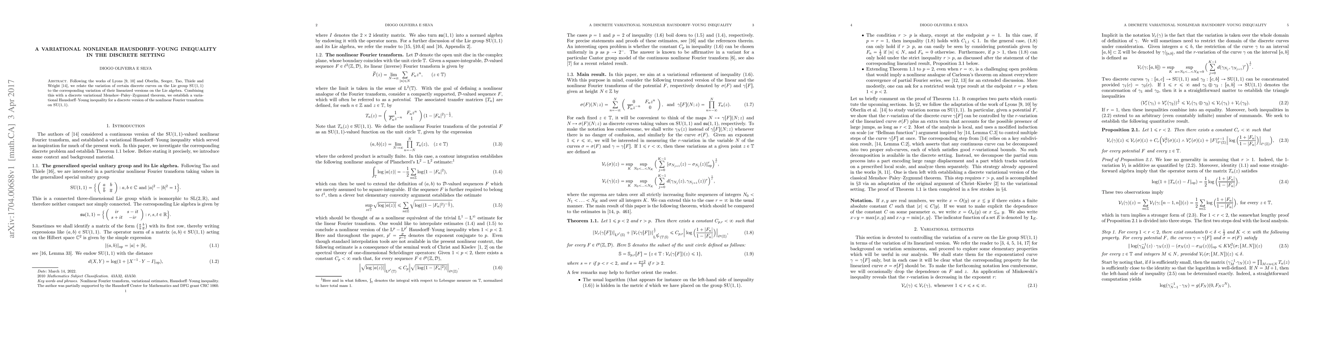 This paper establishes a variational Hausdorff-Young inequality for a discrete nonlinear Fourier transform on the Lie group SU(1,1) by relating the variation of discrete curves to their linearized versions, combining this with a discrete Menshov-Paley-Zygmund theorem.