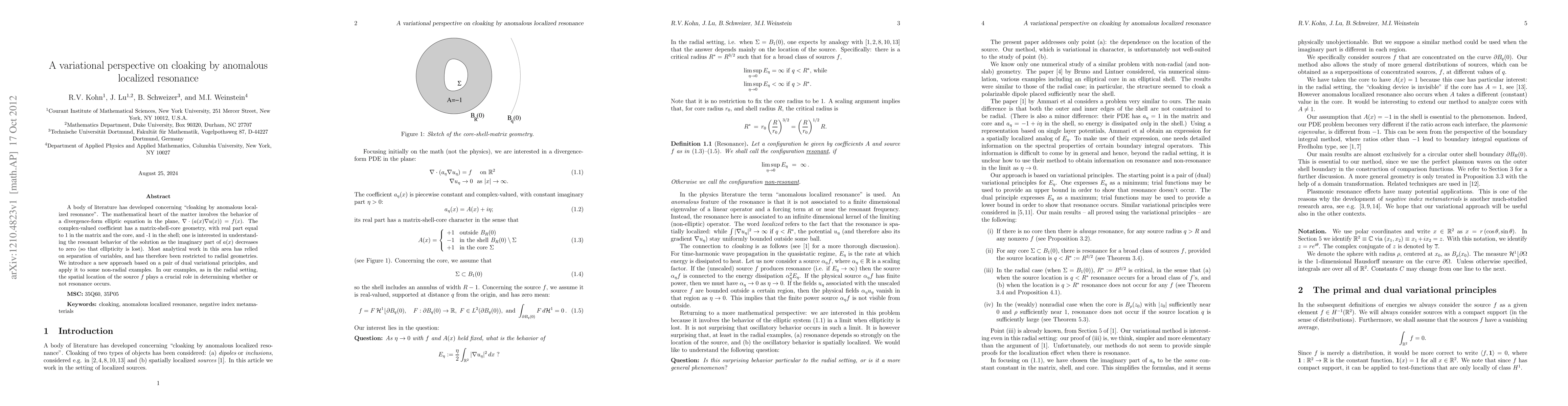 A body of literature has developed concerning "cloaking by anomalous localized resonance". The mathematical heart of the matter involves the behavior of a divergence-form elliptic equation in the plane, $\nabla\cdot (a(x)\nabla u(x)) = f(x)$. The complex-valued coefficient has a matrix-shell-core geometry, with real part equal to 1 in the matrix and the core, and -1 in the shell; one is interested in understanding the resonant behavior of the solution as the imaginary part of $a(x)$ decreases to zero (so that ellipticity is lost). Most analytical work in this area has relied on separation of variables, and has therefore been restricted to radial geometries. We introduce a new approach based on a pair of dual variational principles, and apply it to some non-radial examples. In our examples, as in the radial setting, the spatial location of the source $f$ plays a crucial role in determining whether or not resonance occurs.