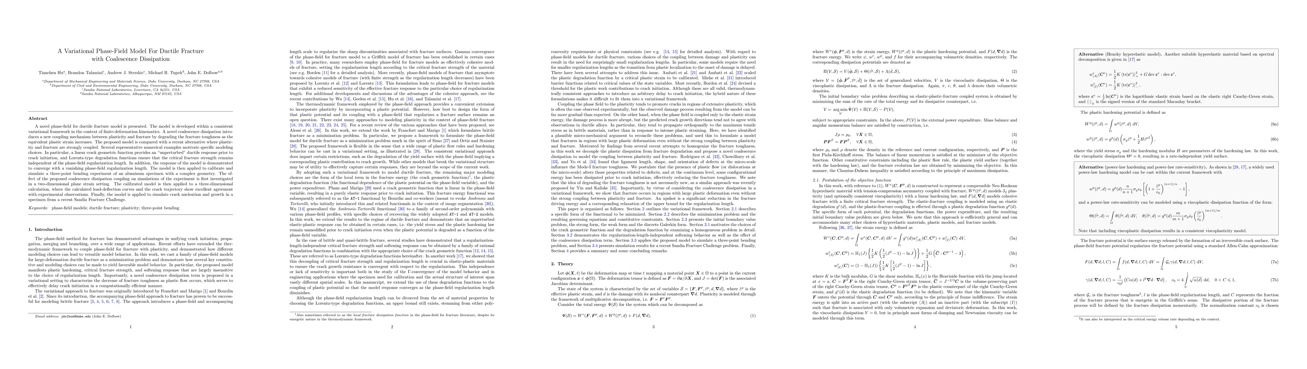 This paper introduces a variational phase-field model for ductile fracture incorporating a novel coalescence dissipation mechanism that couples plasticity and fracture by reducing fracture toughness with increasing plastic strain. The model demonstrates good convergence and is validated through simulations of a three-point bending experiment and a Sandia Fracture Challenge specimen.
