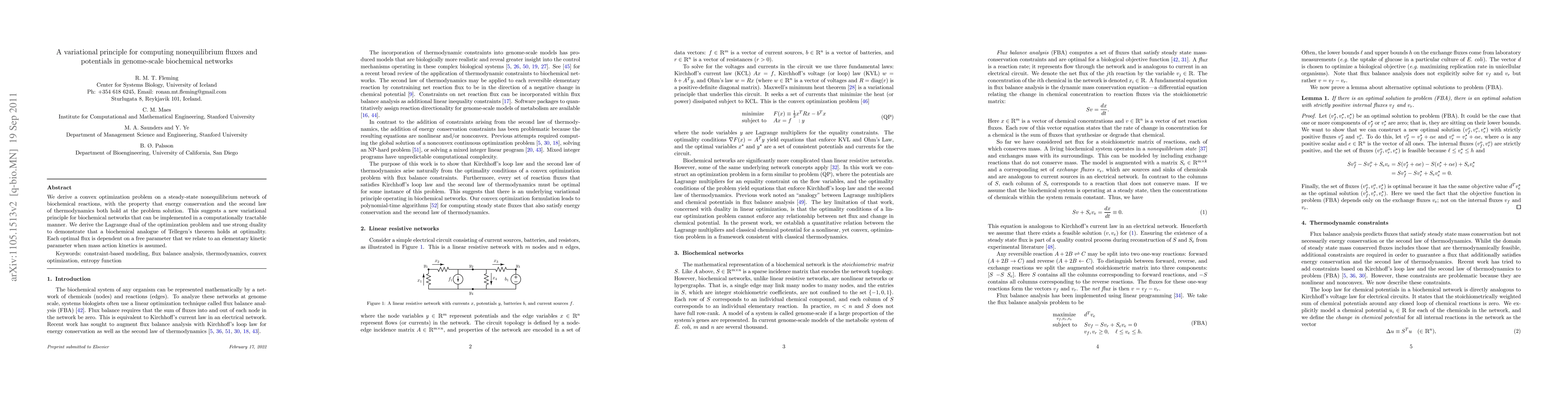This paper proposes a convex optimization framework to compute nonequilibrium fluxes and potentials in genome-scale biochemical networks, ensuring energy conservation and thermodynamic compliance. The authors derive the Lagrange dual and demonstrate a biochemical analogue of Tellegen's theorem, linking optimal fluxes to kinetic parameters under mass action kinetics.