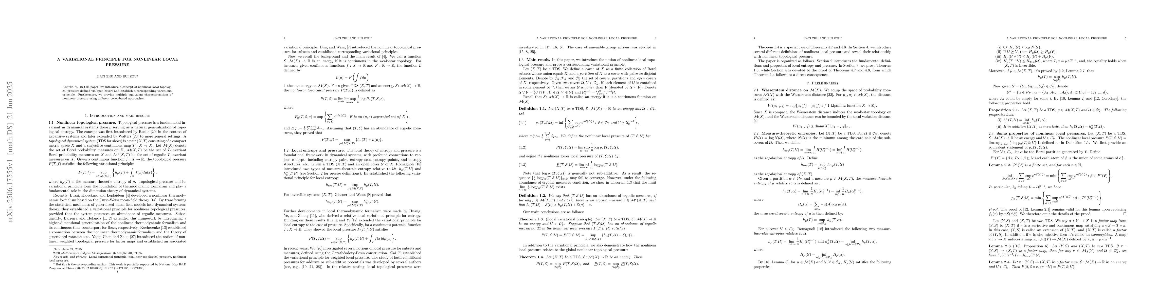 In this paper, we introduce a concept of nonlinear local topological pressure defined via open covers and establish a corresponding variational principle. Furthermore, we provide multiple equivalent characterizations of nonlinear pressure using different cover-based approaches.