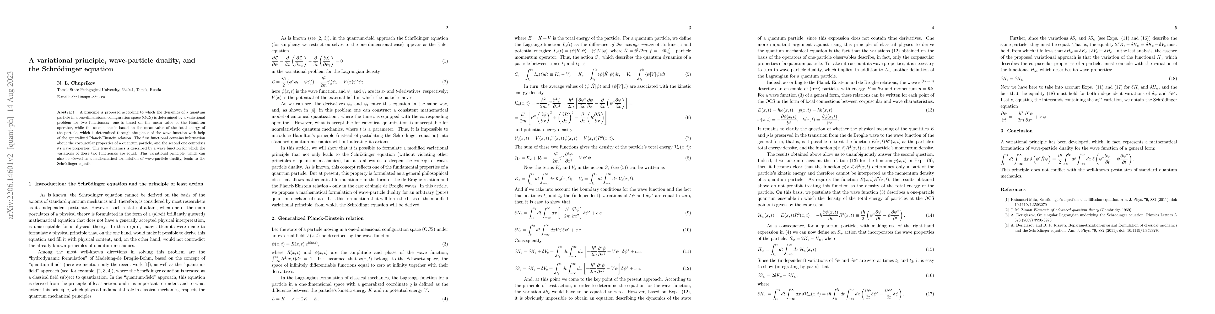 A principle is proposed according to which the dynamics of a quantum particle in a one-dimensional configuration space (OCS) is determined by a variational problem for two functionals: one is based on the mean value of the Hamilton operator, while the second one is based on the mean value of the total energy of the particle, which is determined through the phase of the wave function with help of the generalized Planck-Einstein relation. The first functional contains information about the corpuscular properties of a quantum particle, and the second one comprises its wave properties. The true dynamics is described by a wave function for which the variations of these two functionals are equal. This variational principle, which can also be viewed as a mathematical formulation of wave-particle duality, leads to the Schr\"{o}dinger equation.
