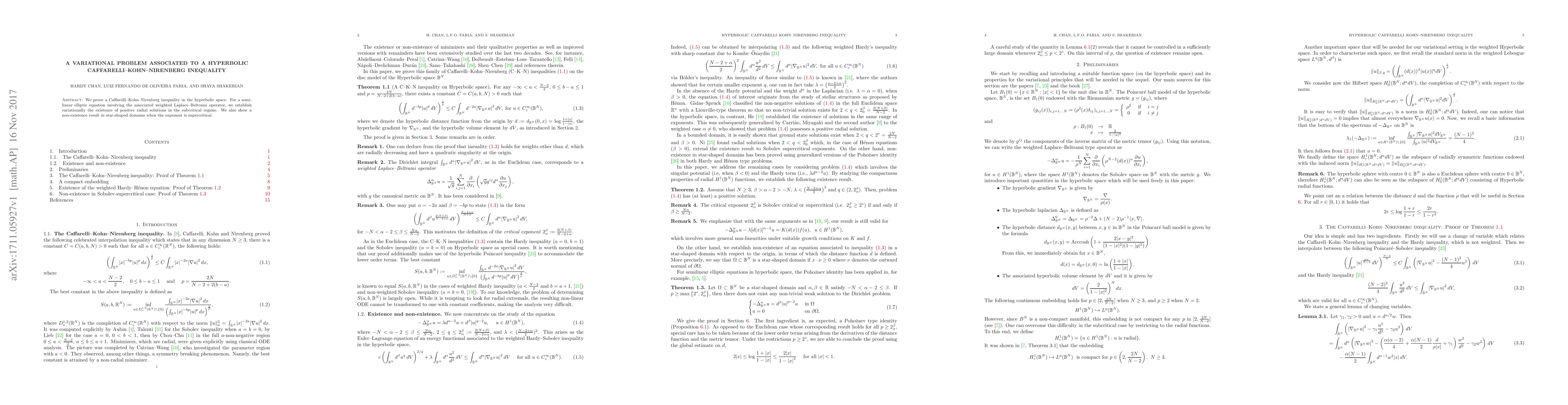 This paper proves a Caffarelli-Kohn-Nirenberg inequality in hyperbolic space and establishes the existence of positive radial solutions for a semilinear elliptic equation in the subcritical regime. It also demonstrates non-existence of such solutions in star-shaped domains when the exponent is supercritical.