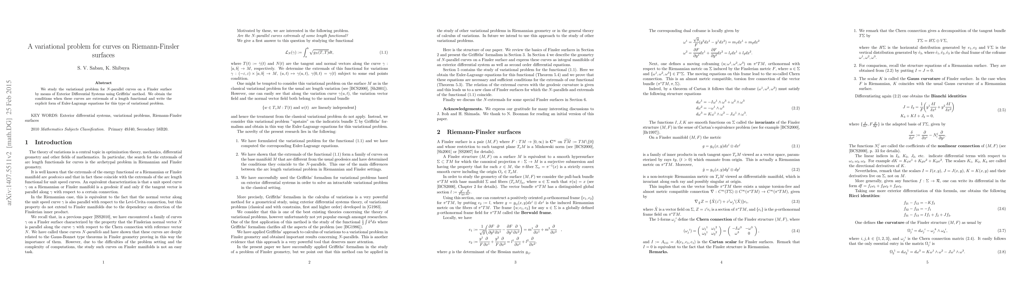 This paper investigates the variational problem for $N$-parallel curves on a Riemann-Finsler surface using Exterior Differential Systems and Griffiths' method. It derives the conditions for these curves to be extremals of a length functional and provides the explicit form of the Euler-Lagrange equations for this variational problem.