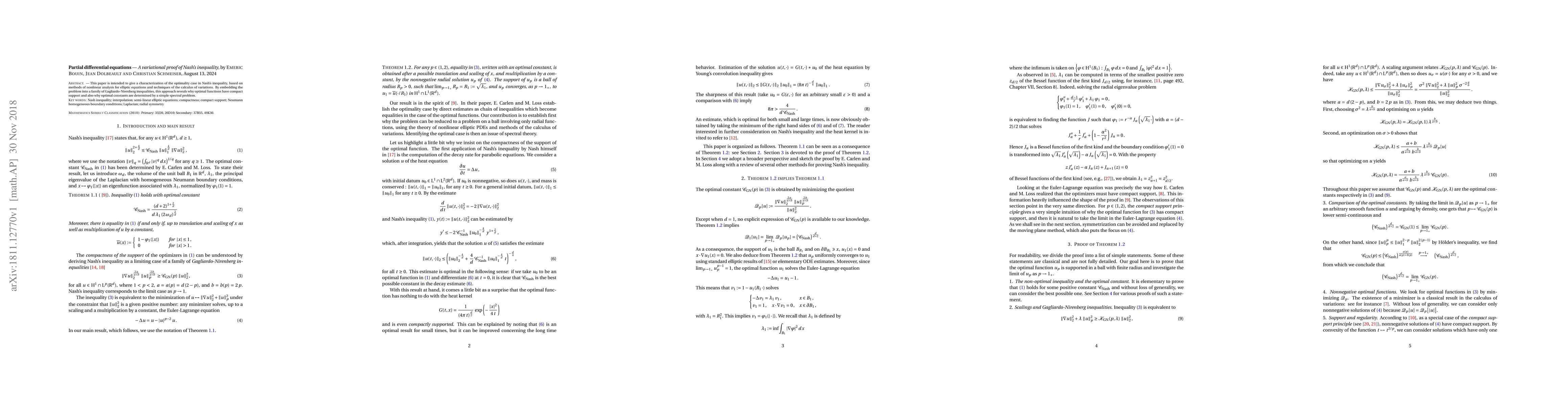 This paper characterizes the optimality in Nash's inequality using nonlinear analysis and variational methods, showing that optimal functions have compact support due to spectral properties determined by a simple eigenvalue problem.