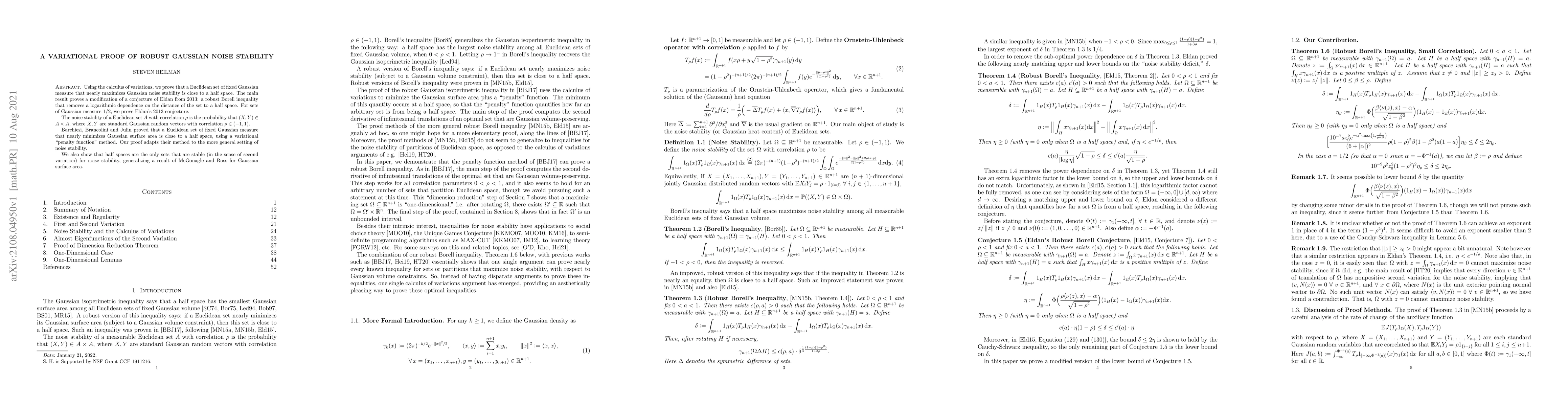 This paper uses variational calculus to prove that a Euclidean set with nearly maximal Gaussian noise stability is close to a half space, confirming a modified conjecture by Eldan that removes a logarithmic dependence on the distance to a half space. It also establishes that half spaces are the only sets that are stable for noise stability.