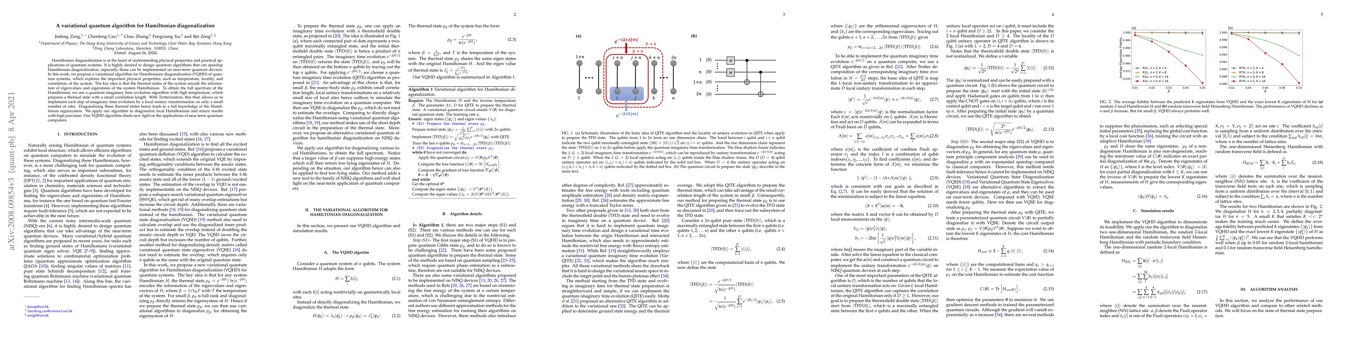 This paper proposes a variational quantum algorithm (VQHD) for Hamiltonian diagonalization, leveraging thermal states to encode Hamiltonian information. The algorithm uses quantum imaginary time evolution and Trotterization for efficient local unitary transformations, enabling precise diagonalization of local Hamiltonians on near-term quantum devices.
