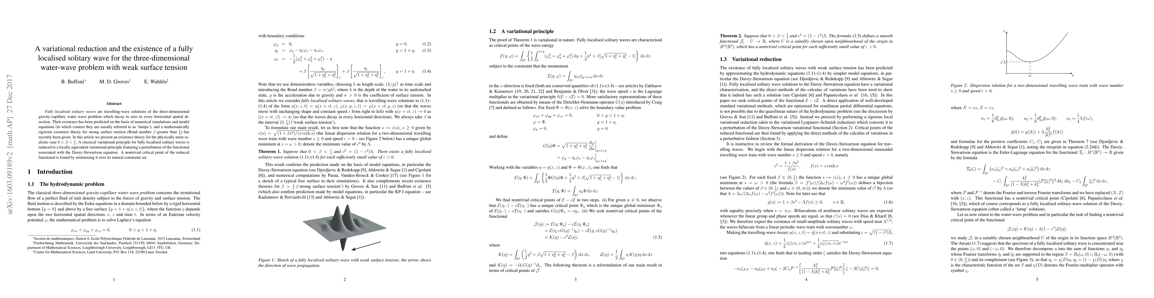 This paper presents a rigorous existence theory for fully localised solitary waves in three-dimensional water-wave problems with weak surface tension. It employs a variational reduction technique to derive a locally equivalent principle and finds a nontrivial critical point by minimising the reduced functional over its constraint set.