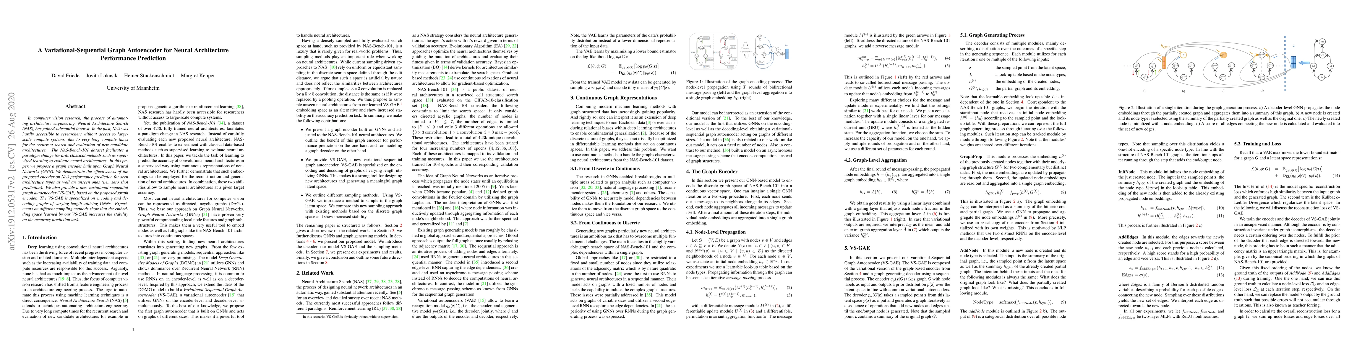 In computer vision research, the process of automating architecture engineering, Neural Architecture Search (NAS), has gained substantial interest. In the past, NAS was hardly accessible to researchers without access to large-scale compute systems, due to very long compute times for the recurrent search and evaluation of new candidate architectures. The NAS-Bench-101 dataset facilitates a paradigm change towards classical methods such as supervised learning to evaluate neural architectures. In this paper, we propose a graph encoder built upon Graph Neural Networks (GNN). We demonstrate the effectiveness of the proposed encoder on NAS performance prediction for seen architecture types as well an unseen ones (i.e., zero shot prediction). We also provide a new variational-sequential graph autoencoder (VS-GAE) based on the proposed graph encoder. The VS-GAE is specialized on encoding and decoding graphs of varying length utilizing GNNs. Experiments on different sampling methods show that the embedding space learned by our VS-GAE increases the stability on the accuracy prediction task.