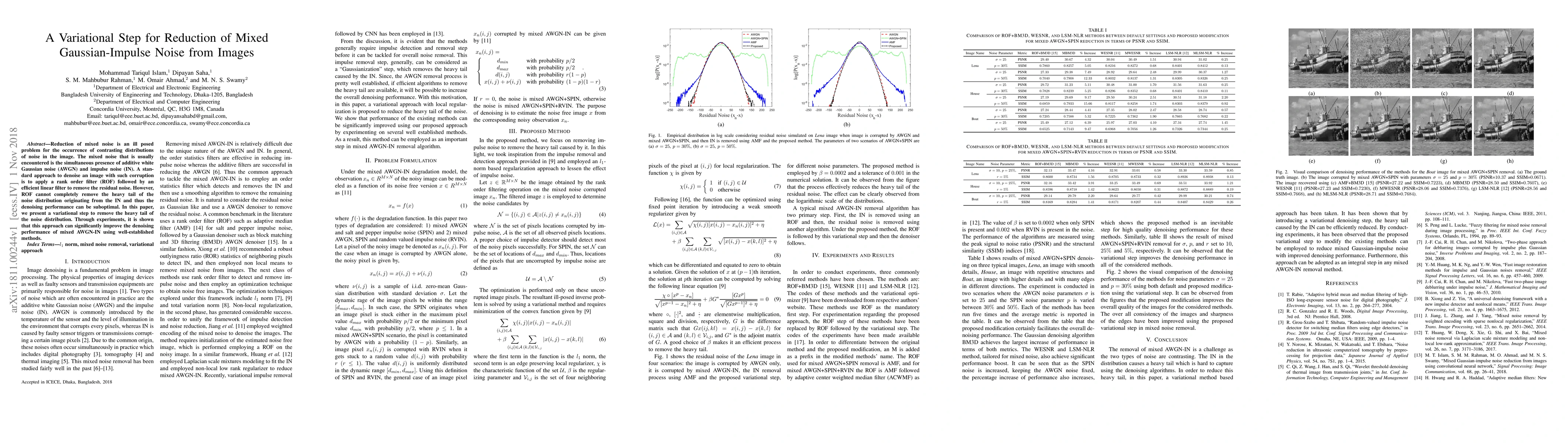Reduction of mixed noise is an ill posed problem for the occurrence of contrasting distributions of noise in the image. The mixed noise that is usually encountered is the simultaneous presence of additive white Gaussian noise (AWGN) and impulse noise (IN). A standard approach to denoise an image with such corruption is to apply a rank order filter (ROF) followed by an efficient linear filter to remove the residual noise. However, ROF cannot completely remove the heavy tail of the noise distribution originating from the IN and thus the denoising performance can be suboptimal. In this paper, we present a variational step to remove the heavy tail of the noise distribution. Through experiments, it is shown that this approach can significantly improve the denoising performance of mixed AWGN-IN using well-established methods.