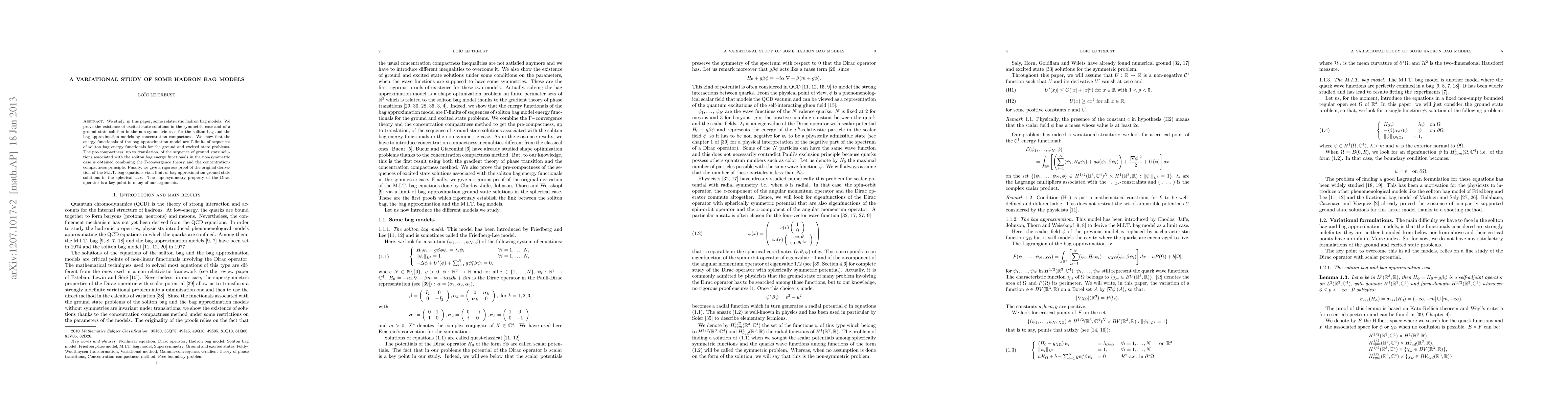Quantum chromodynamics (QCD) is the theory of strong interaction and accounts for the internal structure of hadrons. Physicists introduced phe- nomenological models such as the M.I.T. bag model, the bag approximation and the soliton bag model to study the hadronic properties. We prove, in this paper, the existence of excited state solutions in the symmetric case and of a ground state solution in the non-symmetric case for the soliton bag and the bag approximation models thanks to the concentration compactness method. We show that the energy functionals of the bag approximation model are Gamma -limits of sequences of soliton bag model energy functionals for the ground and excited state problems. The pre- compactness, up to translation, of the sequence of ground state solutions associated with the soliton bag energy functionals in the non-symmetric case is obtained combining the Gamma -convergence theory and the concentration-compactness method. Finally, we give a rigorous proof of the original derivation of the M.I.T. bag equations done by Chodos, Jaffe, Johnson, Thorn and Weisskopf via a limit of bag approximation ground state solutions in the spherical case. The supersymmetry property of the Dirac operator is the key point in many of our arguments.