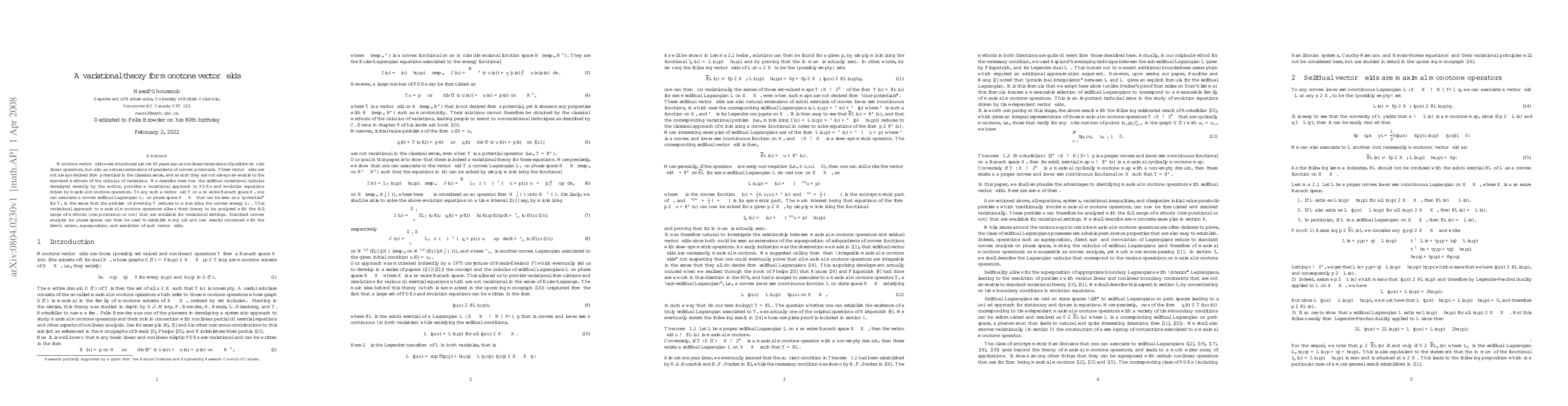 This paper presents a variational theory for monotone vector fields using a selfdual variational calculus, allowing the analysis of maximal monotone operators through the minimization of a convex selfdual Lagrangian, thus extending classical variational methods. The approach facilitates the identification, superposition, and resolution of these vector fields using standard convex analysis.