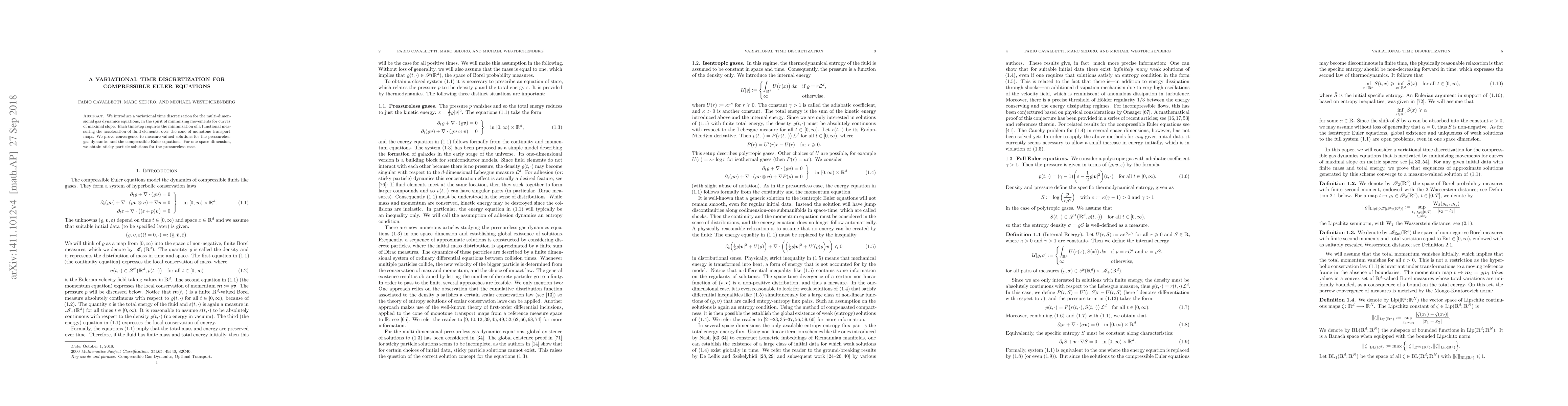This paper proposes a variational time discretization method for the compressible Euler equations, focusing on minimizing functionals that measure fluid acceleration. The method converges to measure-valued solutions for pressureless gas dynamics and compressible Euler equations, yielding sticky particle solutions in one dimension.