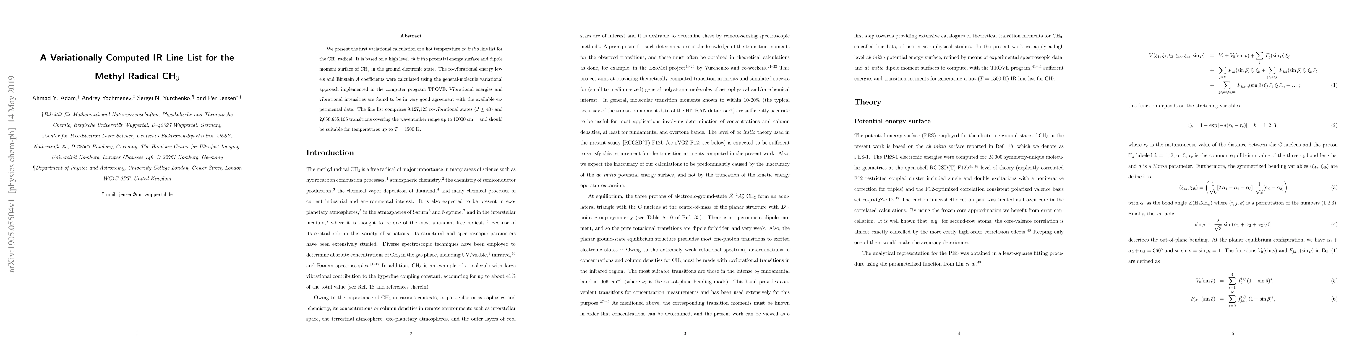 We present the first variational calculation of a hot temperature ab initio line list for the CH$_3$ radical. It is based on a high level ab initio potential energy surface and dipole moment surface of CH$_3$ in the ground electronic state. The ro-vibrational energy levels and Einstein $A$ coefficients were calculated using the general-molecule variational approach implemented in the computer program TROVE. Vibrational energies and vibrational intensities are found to be in very good agreement with the available experimental data. The line list comprises 9,127,123 ro-vibrational states ($J\le 40$) and 2,058,655,166 transitions covering the wavenumber range up to 10000 cm$^{-1}$ and should be suitable for temperatures up to $T= 1500$ K.