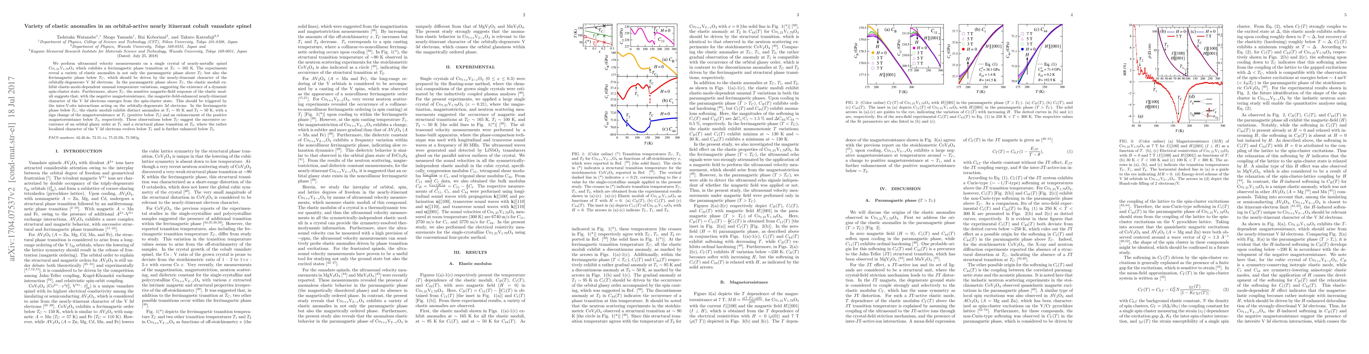We perform ultrasound velocity measurements on a single crystal of nearly-metallic spinel Co$_{1.21}$V$_{1.79}$O$_4$ which exhibits a ferrimagnetic phase transition at $T_C \sim$ 165 K. The experiments reveal a variety of elastic anomalies in not only the paramagnetic phase above $T_C$ but also the ferrimagnetic phase below $T_C$, which should be driven by the nearly-itinerant character of the orbitally-degenerate V 3$d$ electrons. In the paramagnetic phase above $T_C$, the elastic moduli exhibit elastic-mode-dependent unusual temperature variations, suggesting the existence of a dynamic spin-cluster state. Furthermore, above $T_C$, the sensitive magnetic-field response of the elastic moduli suggests that, with the negative magnetoresistance, the magnetic-field-enhanced nearly-itinerant character of the V 3$d$ electrons emerges from the spin-cluster state. This should be triggered by the inter-V-site interactions acting on the orbitally-degenerate 3$d$ electrons. In the ferrimagnetic phase below $T_C$, the elastic moduli exhibit distinct anomalies at $T_1\sim$ 95 K and $T_2\sim$ 50 K, with a sign change of the magnetoresistance at $T_1$ (positive below $T_1$) and an enhancement of the positive magnetoresistance below $T_2$, respectively. These observations below $T_C$ suggest the successive occurrence of an orbital glassy order at $T_1$ and a structural phase transition at $T_2$, where the rather localized character of the V 3$d$ electrons evolves below $T_1$ and is further enhanced below $T_2$.