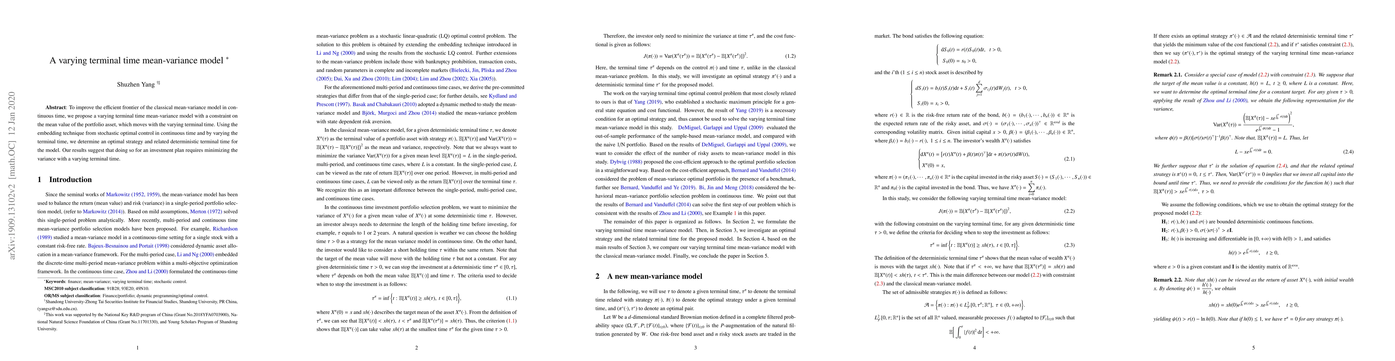 This paper proposes a varying terminal time mean-variance model to enhance the efficient frontier of the classical model. It determines an optimal strategy using stochastic optimal control techniques and suggests that minimizing variance with a flexible terminal time improves investment plans.