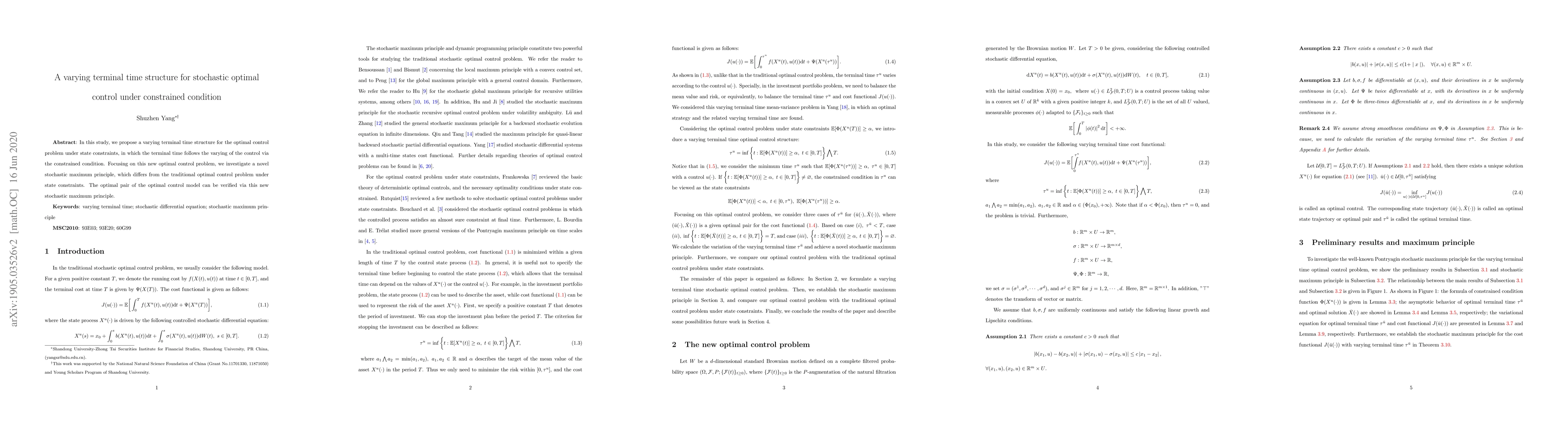 This paper introduces a new varying terminal time structure for stochastic optimal control problems under state constraints, proposing a novel stochastic maximum principle to determine the optimal control. This approach differs from traditional methods and allows verification of the optimal control pair.