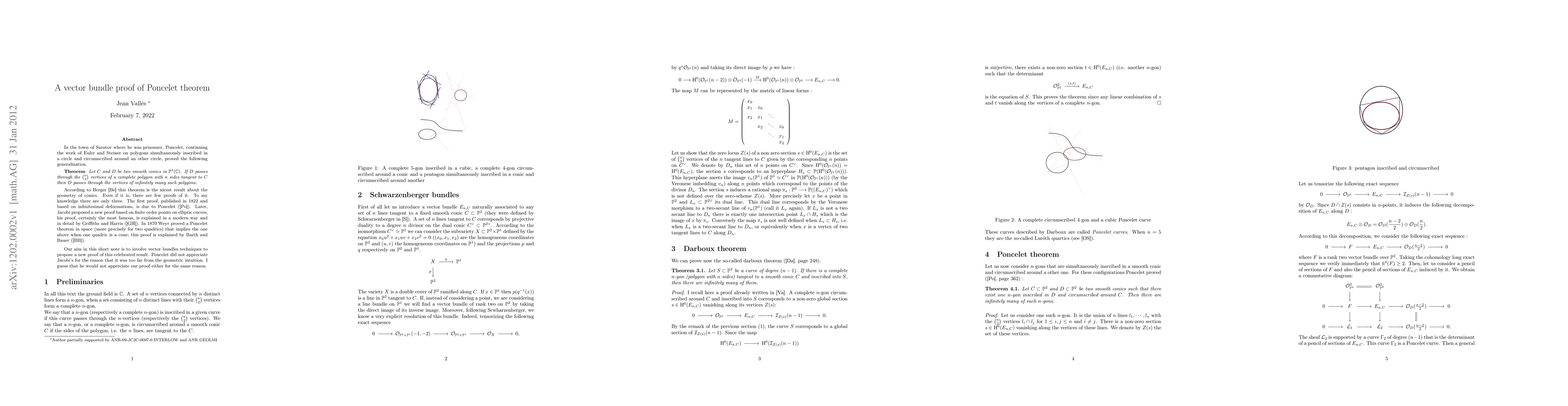 This paper proposes a new proof of Poncelet's theorem using vector bundle techniques, generalizing the result about polygons inscribed in and circumscribed around conics. The authors aim to provide a modern approach to the theorem, contrasting with previous proofs based on infinitesimal deformations, elliptic curves, and quadrics.
