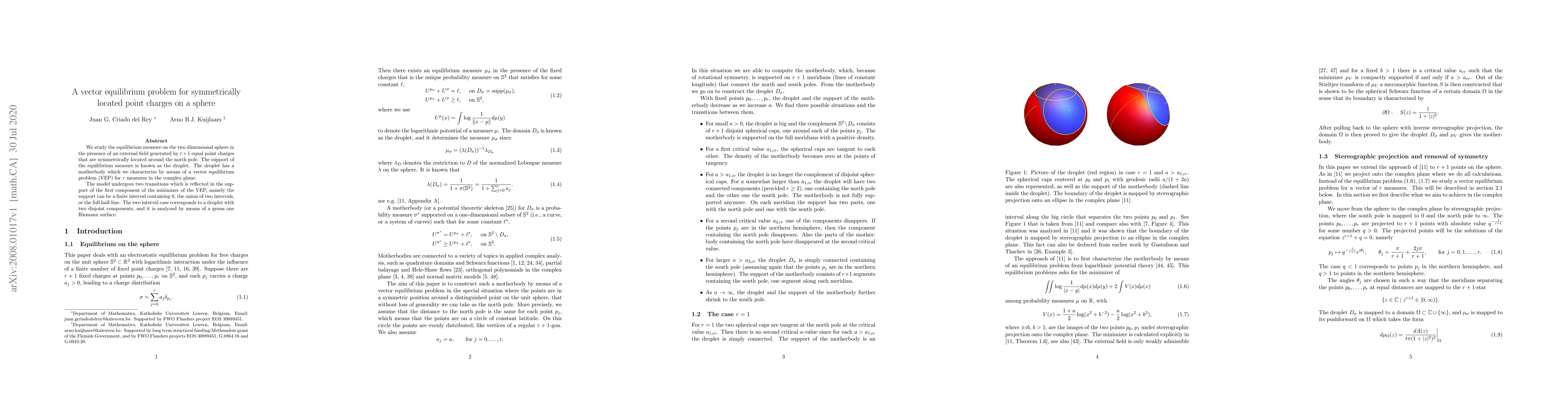 Researchers study equilibrium measures on a sphere with r+1 symmetrically located point charges, finding two transitions that affect the shape of the support, which can be a finite interval or two disjoint components.