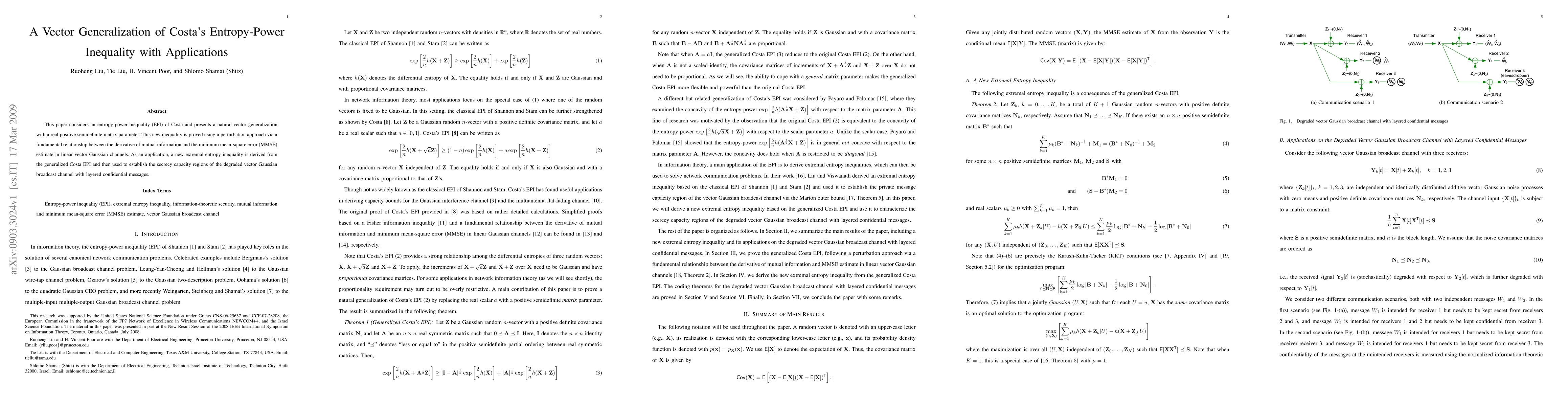 This paper considers an entropy-power inequality (EPI) of Costa and presents a natural vector generalization with a real positive semidefinite matrix parameter. This new inequality is proved using a perturbation approach via a fundamental relationship between the derivative of mutual information and the minimum mean-square error (MMSE) estimate in linear vector Gaussian channels. As an application, a new extremal entropy inequality is derived from the generalized Costa EPI and then used to establish the secrecy capacity regions of the degraded vector Gaussian broadcast channel with layered confidential messages.