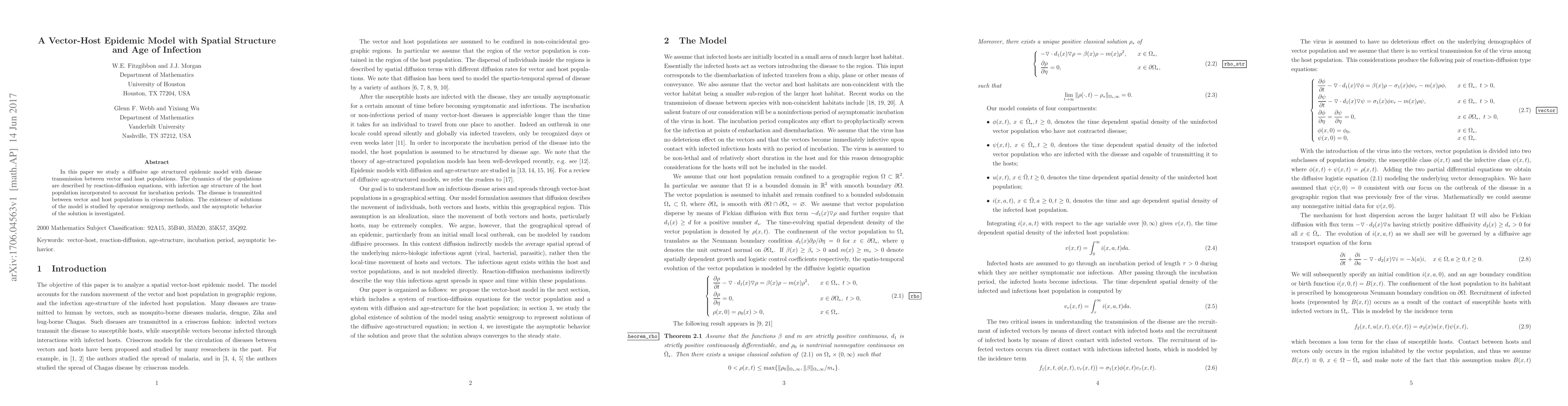 This paper develops a diffusive age-structured epidemic model to study disease transmission between vector and host populations, incorporating host infection age to account for incubation periods. The model's dynamics are analyzed using reaction-diffusion equations and operator semigroup methods to investigate the existence and asymptotic behavior of solutions.