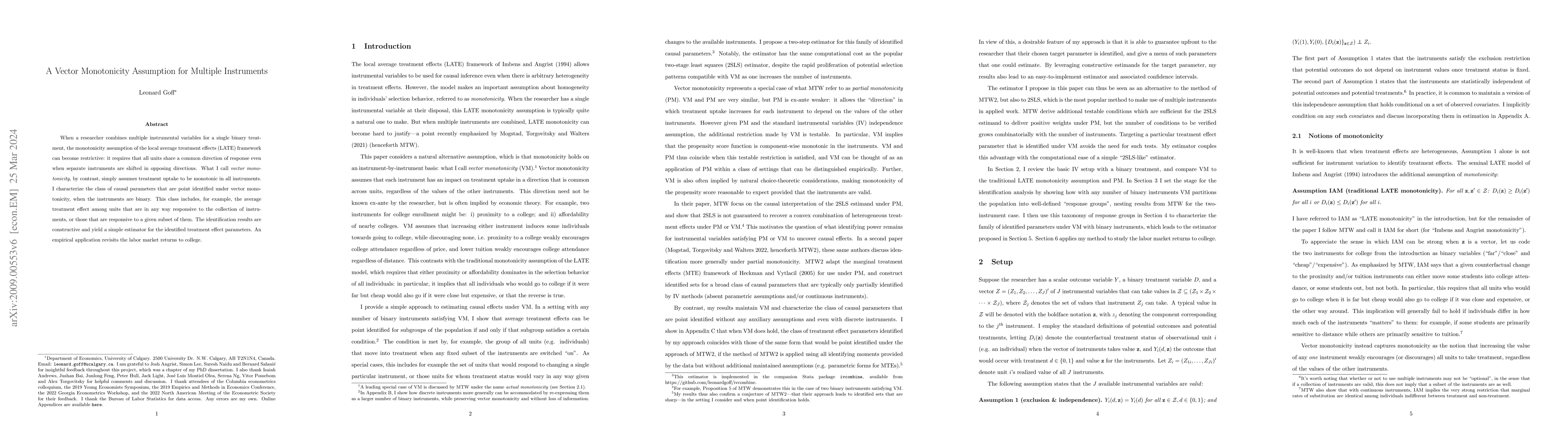 Title: A Vector Monotonicity Assumption for Multiple Instruments Summary: This paper proposes vector monotonicity as a less restrictive alternative to traditional monotonicity in the LATE framework for multiple instruments, identifying causal parameters under this new assumption and providing a simple estimator, with an application to labor market returns to college.