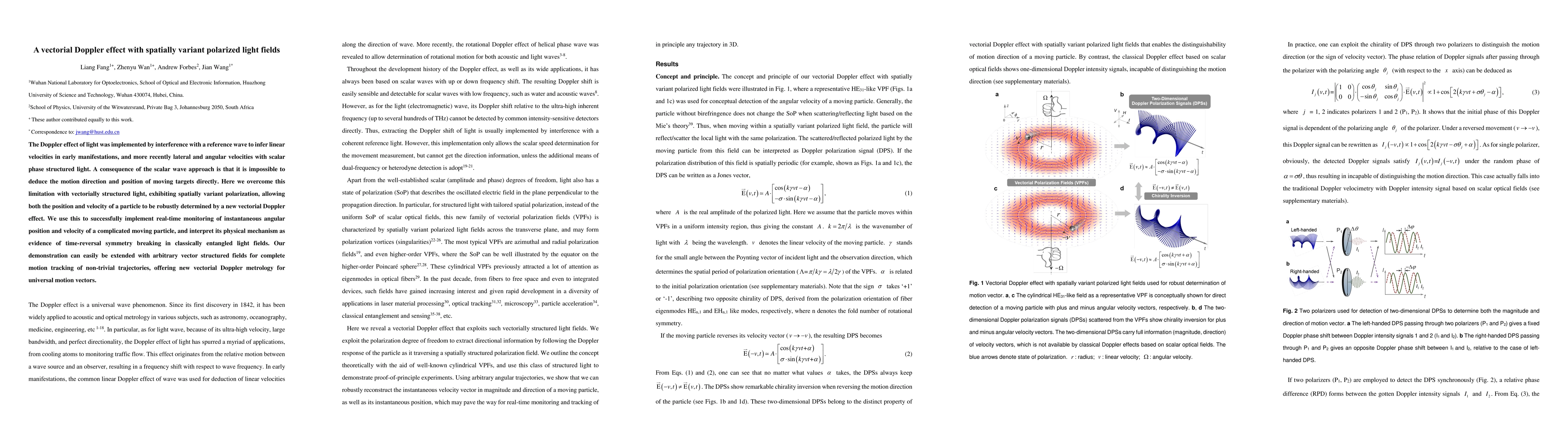 This paper introduces a vectorial Doppler effect using spatially variant polarized light fields to determine both the position and velocity of moving particles, overcoming limitations of scalar wave approaches. The method enables real-time monitoring of angular position and velocity, and suggests time reversal symmetry breaking in entangled light fields.