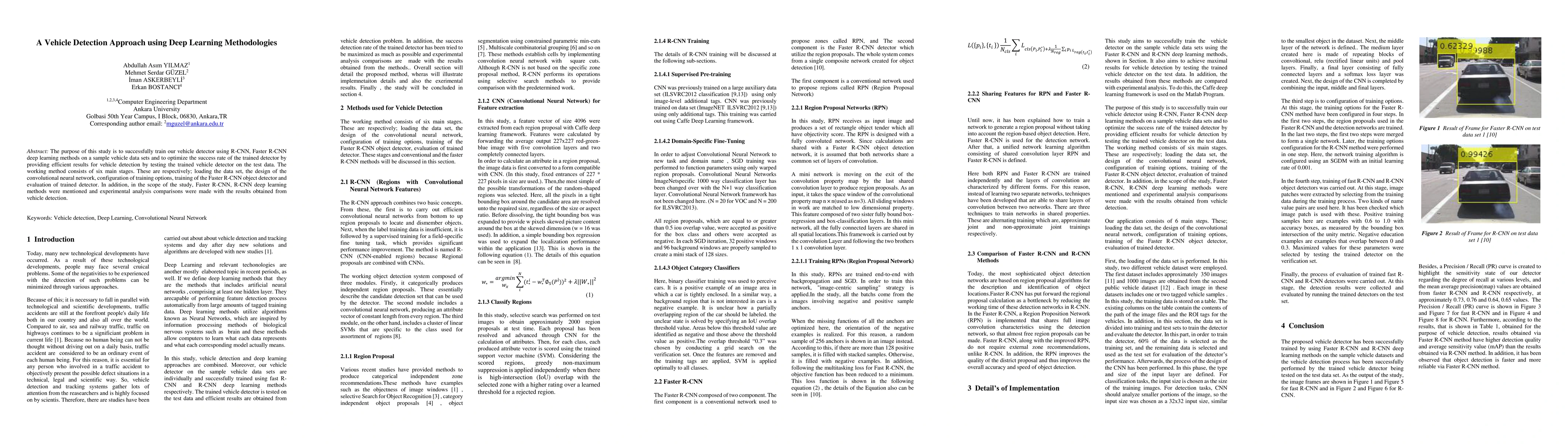 This research investigates the use of R-CNN and Faster R-CNN deep learning techniques to train a vehicle detector on sample datasets. The study optimizes detection success through a structured six-stage process, culminating in the evaluation of the trained detector's performance on test data. For further details, I recommend reviewing the full paper directly.
