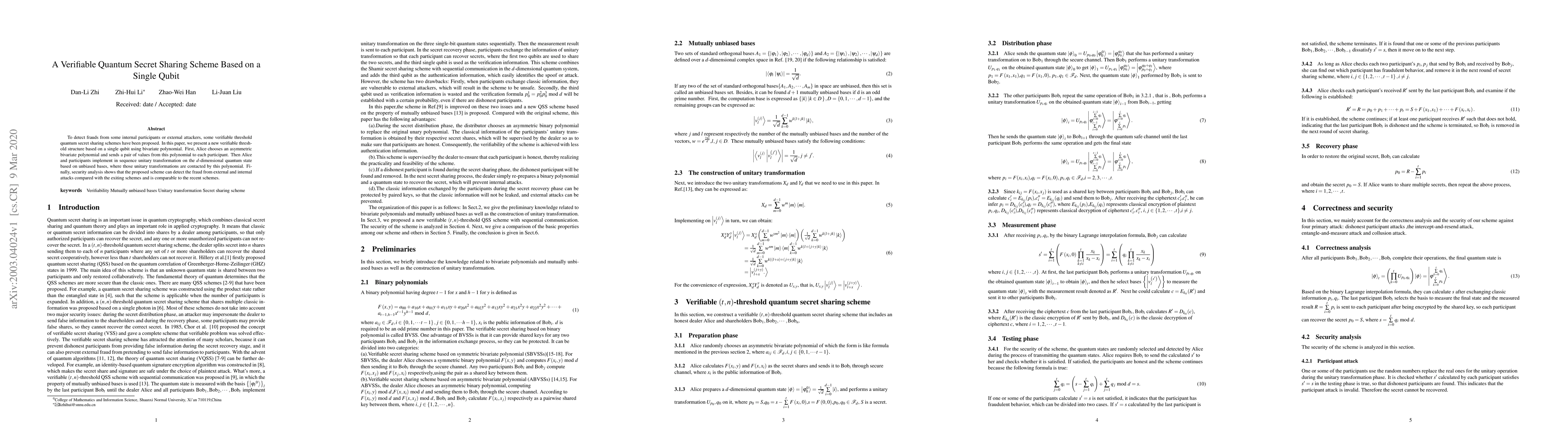 To detect frauds from some internal participants or external attackers, some verifiable threshold quantum secret sharing schemes have been proposed. In this paper, we present a new verifiable threshold structure based on a single qubit using bivariate polynomial. First, Alice chooses an asymmetric bivariate polynomial and sends a pair of values from this polynomial to each participant. Then Alice and participants implement in sequence unitary transformation on the $d$-dimensional quantum state based on unbiased bases, where those unitary transformations are contacted by this polynomial. Finally, security analysis shows that the proposed scheme can detect the fraud from external and internal attacks compared with the exiting schemes and is comparable to the recent schemes.