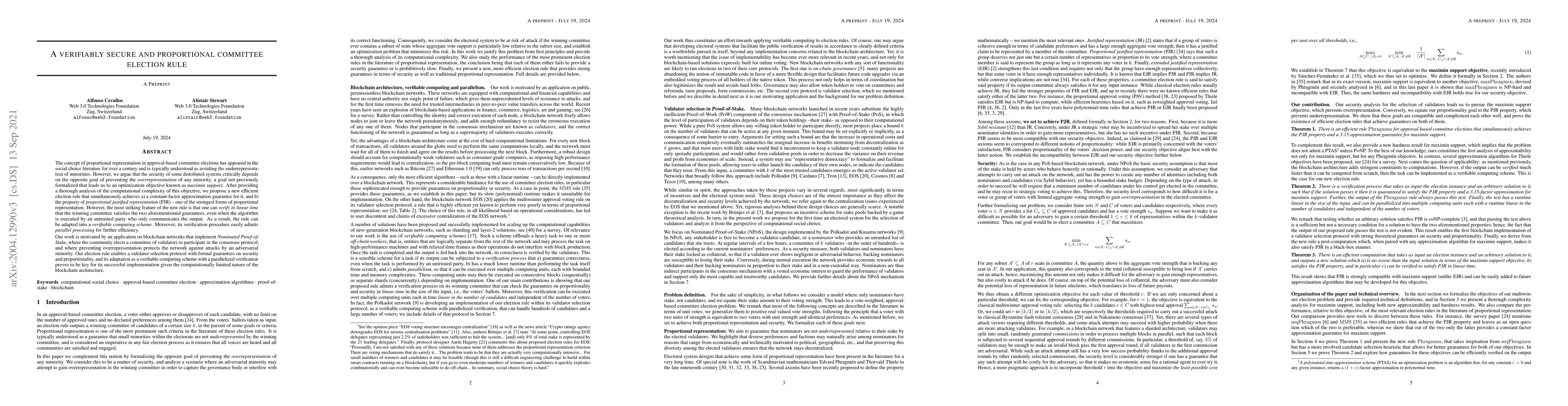 This paper proposes a new election rule that achieves proportional justified representation and a security-focused maximin support objective, ensuring neither underrepresentation nor overrepresentation of any minority. The rule's verification can be performed in linear time, allowing for efficient parallel processing and adaptation into a verifiable computing scheme, crucial for secure committee elections in blockchain networks.