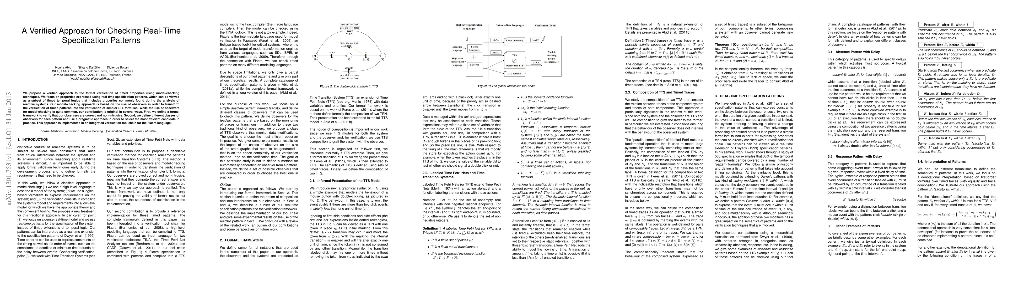 This paper proposes a verified model-checking technique for real-time specification patterns using observers to simplify verification. The authors define a formal framework to ensure observer correctness and introduce a pragmatic method for selecting efficient observers, implemented in a verification tool for the Fiacre language.