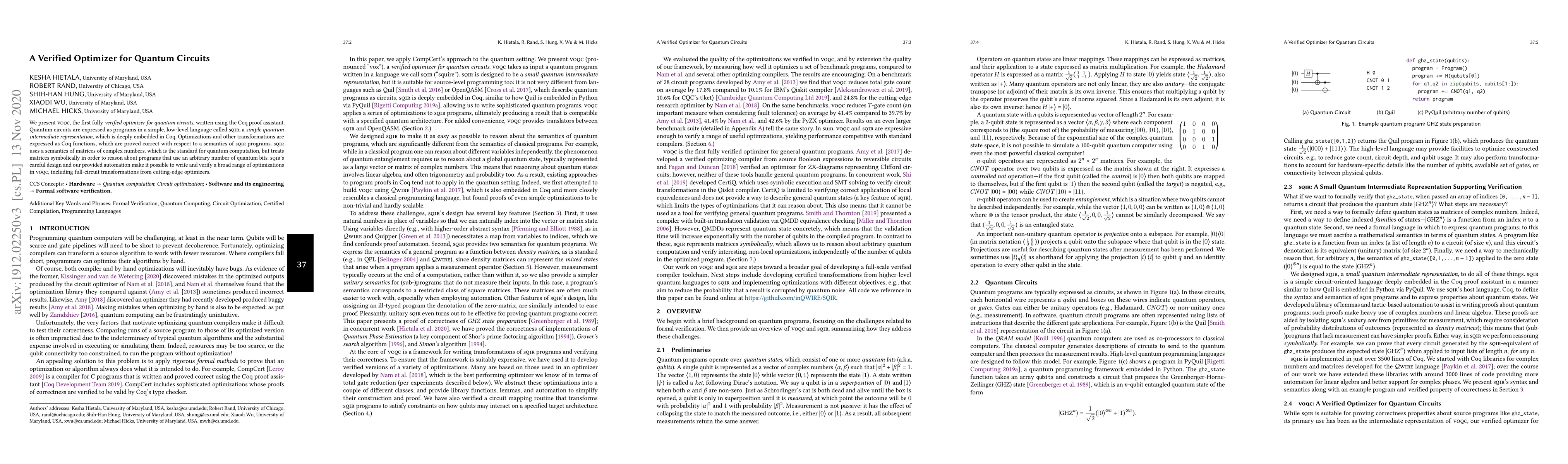 The paper introduces VOQC, the first verified optimizer for quantum circuits using the Coq proof assistant, which optimizes circuits expressed in SQIR, a simple quantum intermediate representation deeply embedded in Coq. The paper demonstrates the correctness of optimizations through Coq functions and a symbolic matrix semantics for arbitrary quantum bits.