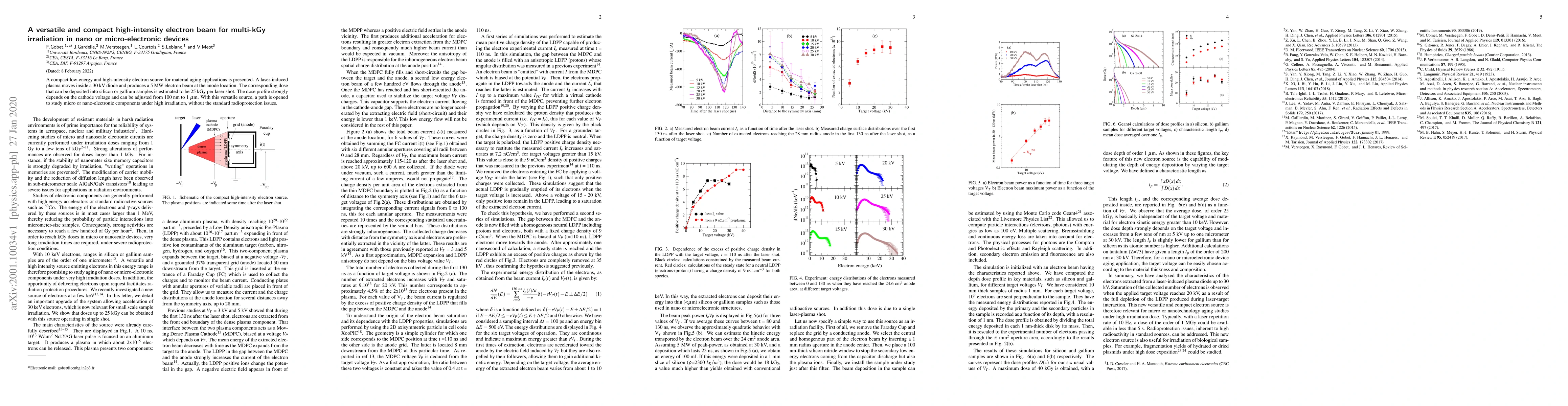 A compact low-energy and high-intensity electron source for material aging applications is presented. A laser-induced plasma moves inside a 30 kV diode and produces a 5 MW electron beam at the anode location. The corresponding dose that can be deposited into silicon or gallium samples is estimated to be 25 kGy per laser shot. The dose profile strongly depends on the cathode voltage and can be adjusted from 100 nm to 1 $\mu$m. With this versatile source, a path is opened to study micro or nano-electronic components under high irradiation, without the standard radioprotection issues.