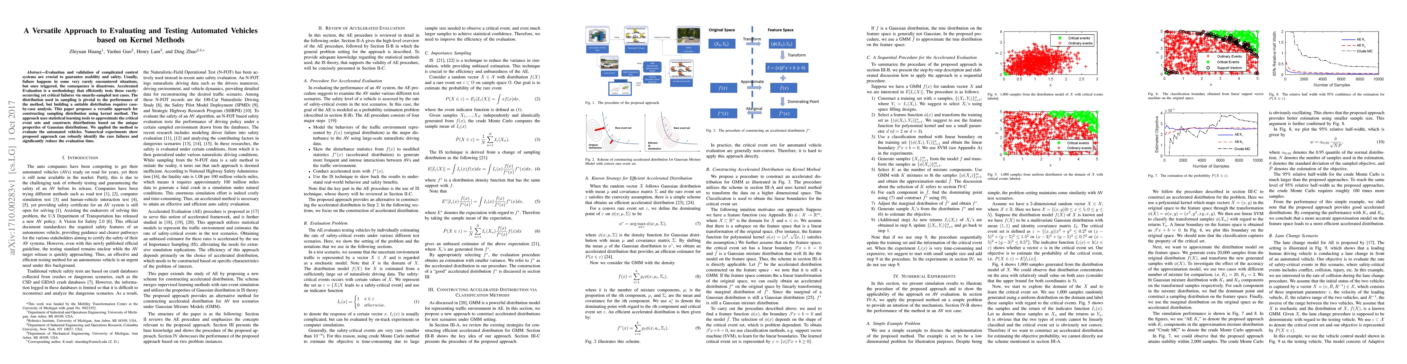 Evaluation and validation of complicated control systems are crucial to guarantee usability and safety. Usually, failure happens in some very rarely encountered situations, but once triggered, the consequence is disastrous. Accelerated Evaluation is a methodology that efficiently tests those rarely-occurring yet critical failures via smartly-sampled test cases. The distribution used in sampling is pivotal to the performance of the method, but building a suitable distribution requires case-by-case analysis. This paper proposes a versatile approach for constructing sampling distribution using kernel method. The approach uses statistical learning tools to approximate the critical event sets and constructs distributions based on the unique properties of Gaussian distributions. We applied the method to evaluate the automated vehicles. Numerical experiments show proposed approach can robustly identify the rare failures and significantly reduce the evaluation time.