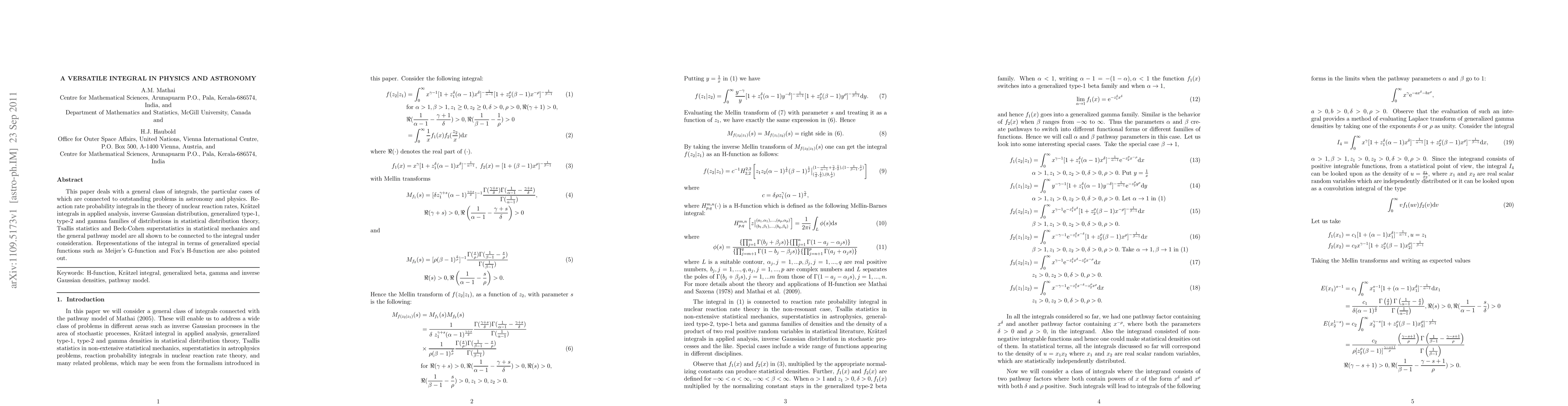 This paper deals with a general class of integrals, the particular cases of which are connected to outstanding problems in astronomy and physics. Reaction rate probability integrals in the theory of nuclear reaction rates, Kr\"atzel integrals in applied analysis, inverse Gaussian distribution, generalized type-1, type-2 and gamma families of distributions in statistical distribution theory, Tsallis statistics and Beck-Cohen superstatistics in statistical mechanics and the general pathway model are all shown to be connected to the integral under consideration. Representations of the integral in terms of generalized special functions such as Meijer's G-function and Fox's H-function are also pointed out.