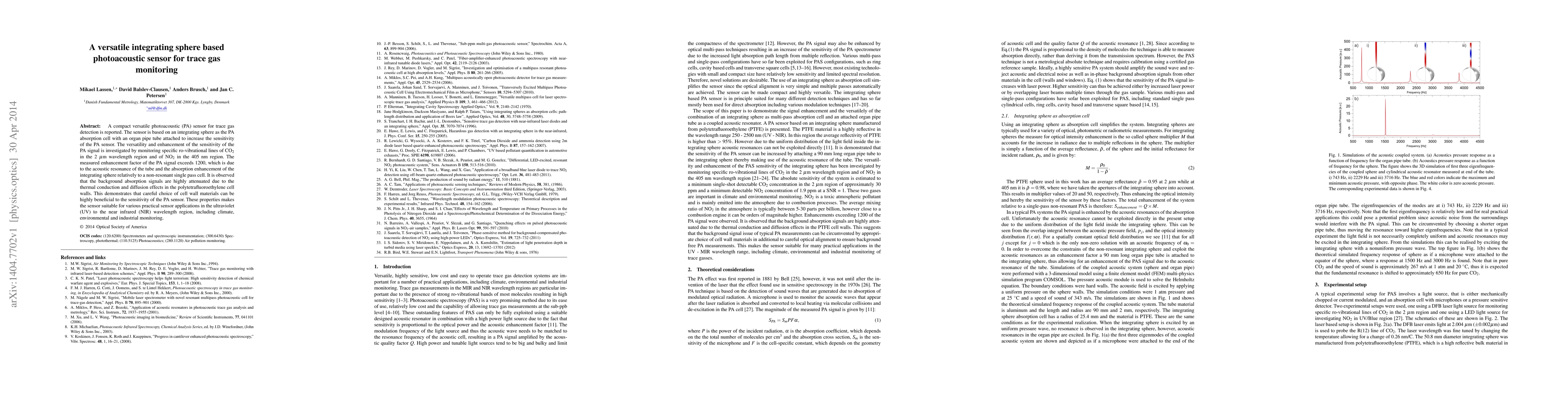 This paper presents a compact, versatile photoacoustic sensor based on an integrating sphere for trace gas detection, achieving a PA signal enhancement factor exceeding 1200. The use of organ pipe resonance and careful material selection for cell walls significantly improves sensitivity and reduces background absorption, making it suitable for diverse monitoring applications.