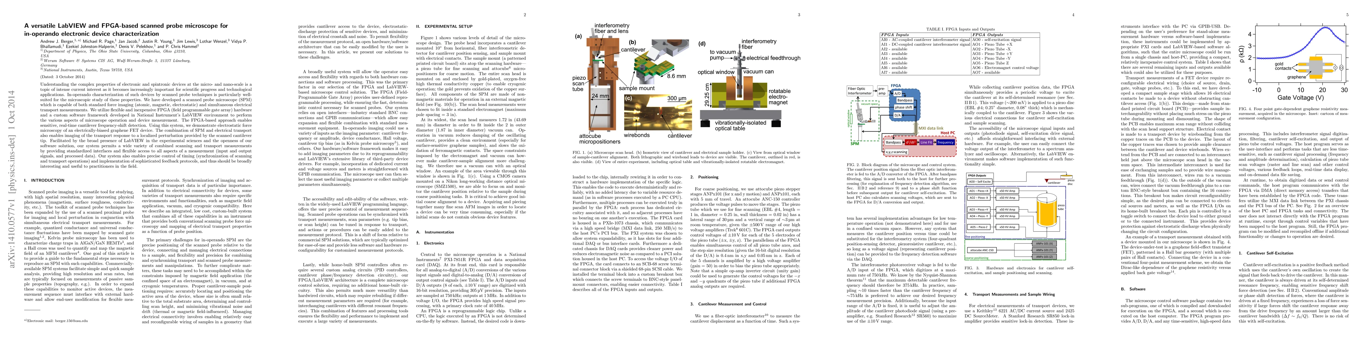 This paper presents a versatile LabVIEW and FPGA-based scanned probe microscope for in-operando electronic device characterization, capable of standard force imaging and simultaneous electrical transport measurements. The system enables sensitive, real-time cantilever frequency-shift detection and precise control of timing, making it broadly useful for a wide range of scanning and transport measurements.