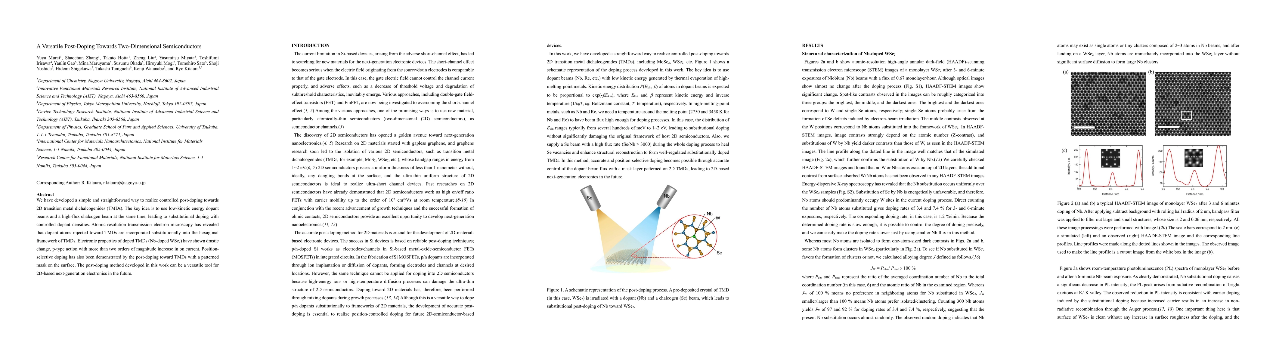 We have developed a simple and straightforward way to realize controlled post-doping towards 2D transition metal dichalcogenides (TMDs). The key idea is to use low-kinetic energy dopant beams and a high-flux chalcogen beam at the same time, leading to substitutional doping with controlled dopant densities. Atomic-resolution transmission electron microscopy has revealed that dopant atoms injected toward TMDs are incorporated substitutionally into the hexagonal framework of TMDs. Electronic properties of doped TMDs (Nb-doped WSe2) have shown drastic change, p-type action with more than two orders of magnitude increase in on current. Position-selective doping has also been demonstrated by the post-doping toward TMDs with a patterned mask on the surface. The post-doping method developed in this work can be a versatile tool for 2D-based next-generation electronics in the future.
