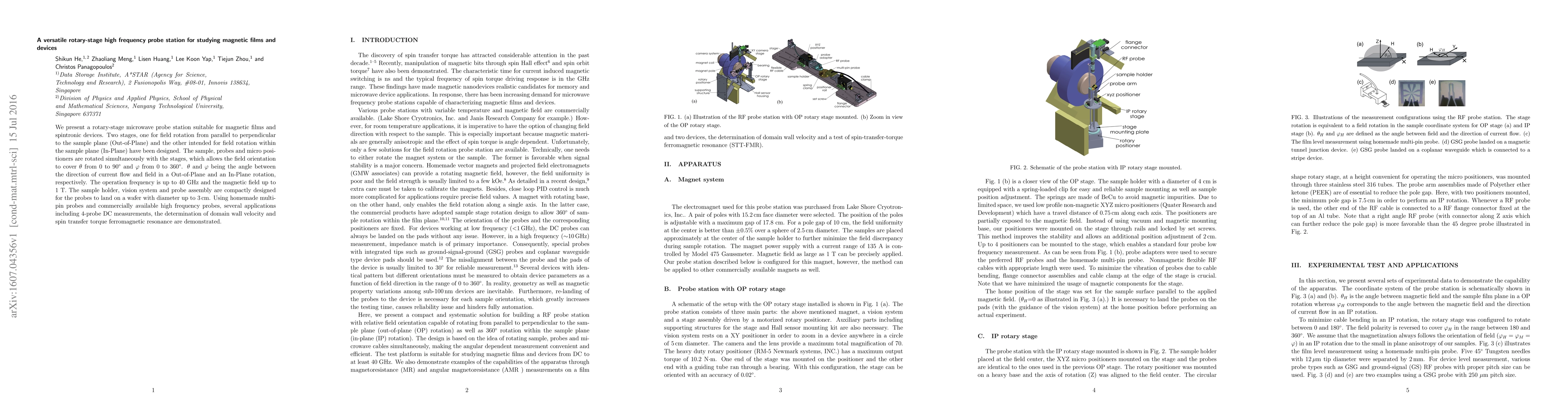 We present a rotary-stage microwave probe station suitable for magnetic films and spintronic devices. Two stages, one for field rotation from parallel to perpendicular to the sample plane (Out-of-Plane) and the other intended for field rotation within the sample plane (In-Plane) have been designed. The sample, probes and micro positioners are rotated simultaneously with the stages, which allows the field orientation to cover $\theta$ from 0 to $90^{\circ}$ and $\varphi$ from 0 to $360^{\circ}$. $\theta$ and $\varphi$ being the angle between the direction of current flow and field in a Out-of-Plane and an In-Plane rotation, respectively. The operation frequency is up to 40 GHz and the magnetic field up to 1 T. The sample holder, vision system and probe assembly are compactly designed for the probes to land on a wafer with diameter up to 3$\,$cm. Using homemade multi-pin probes and commercially available high frequency probes, several applications including 4-probe DC measurements, the determination of domain wall velocity and spin transfer torque ferromagnetic resonance are demonstrated.