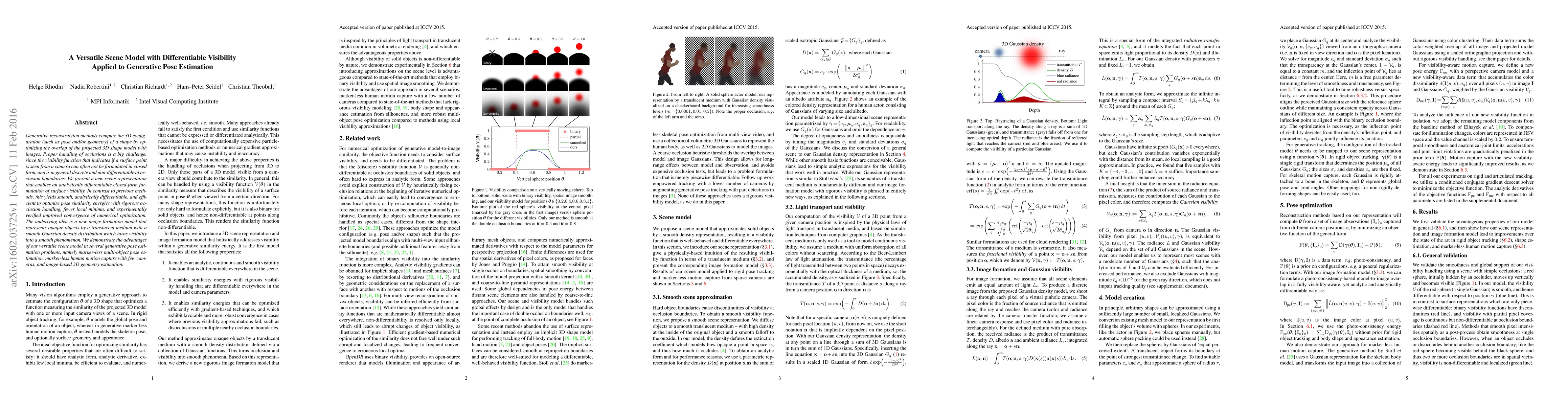 Generative reconstruction methods compute the 3D configuration (such as pose and/or geometry) of a shape by optimizing the overlap of the projected 3D shape model with images. Proper handling of occlusions is a big challenge, since the visibility function that indicates if a surface point is seen from a camera can often not be formulated in closed form, and is in general discrete and non-differentiable at occlusion boundaries. We present a new scene representation that enables an analytically differentiable closed-form formulation of surface visibility. In contrast to previous methods, this yields smooth, analytically differentiable, and efficient to optimize pose similarity energies with rigorous occlusion handling, fewer local minima, and experimentally verified improved convergence of numerical optimization. The underlying idea is a new image formation model that represents opaque objects by a translucent medium with a smooth Gaussian density distribution which turns visibility into a smooth phenomenon. We demonstrate the advantages of our versatile scene model in several generative pose estimation problems, namely marker-less multi-object pose estimation, marker-less human motion capture with few cameras, and image-based 3D geometry estimation.