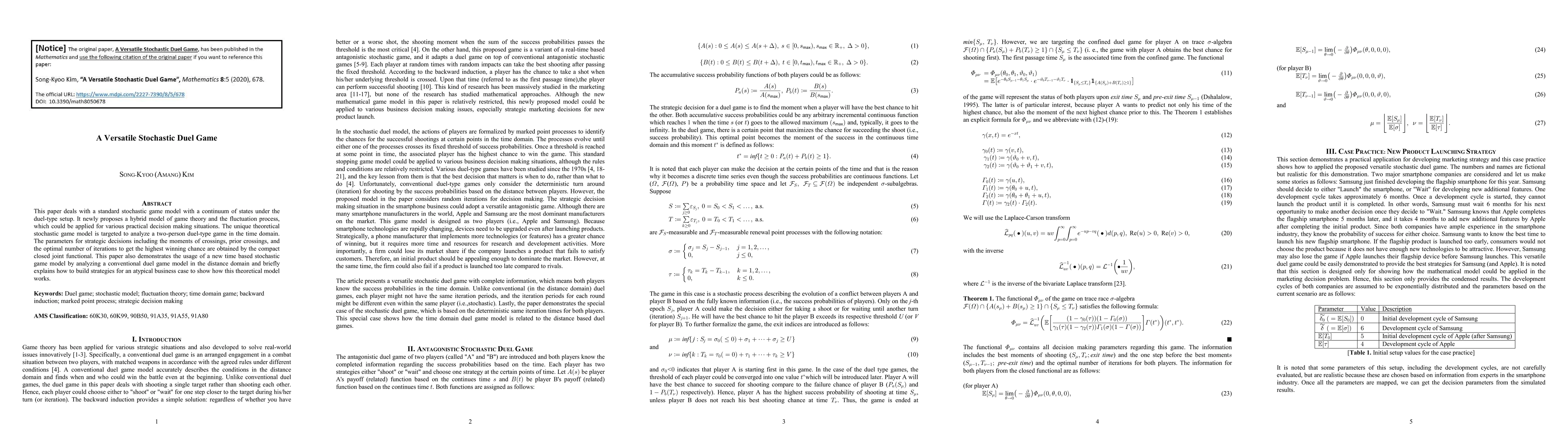This paper deals with a standard stochastic game model with a continuum of states under the duel-type setup. It newly proposes a hybrid model of game theory and the fluctuation process, which could be applied for various practical decision making situations. The unique theoretical stochastic game model is targeted to analyze a two-person duel-type game in the time domain. The parameters for strategic decisions including the moments of crossings, prior crossings, and the optimal number of iterations to get the highest winning chance are obtained by the compact closed joint functional. This paper also demonstrates the usage of a new time based stochastic game model by analyzing a conventional duel game model in the distance domain and briefly explains how to build strategies for an atypical business case to show how this theoretical model works.