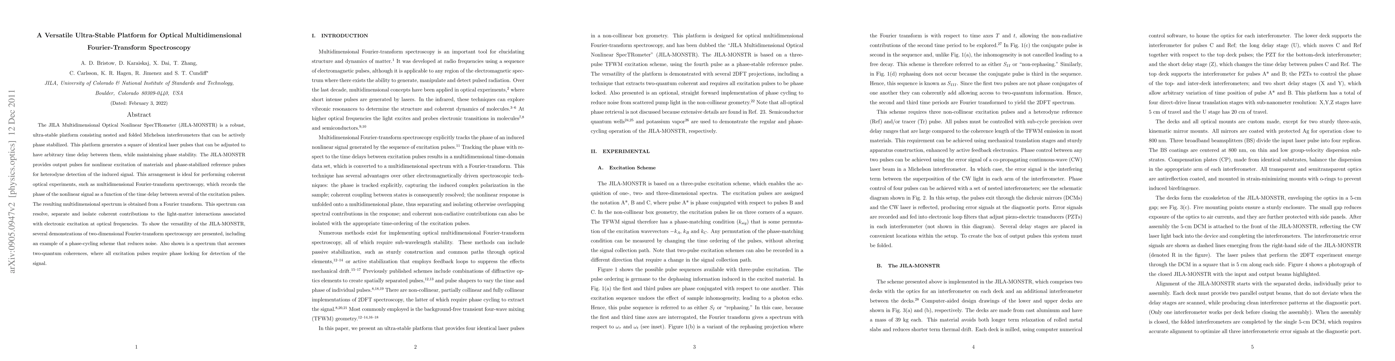 The JILA-MONSTR platform employs nested interferometers for ultra-stable, multidimensional Fourier-transform spectroscopy, generating phase-stable laser pulses for material excitation and heterodyne detection, and demonstrating versatility through noise-reduced two-dimensional spectroscopy.