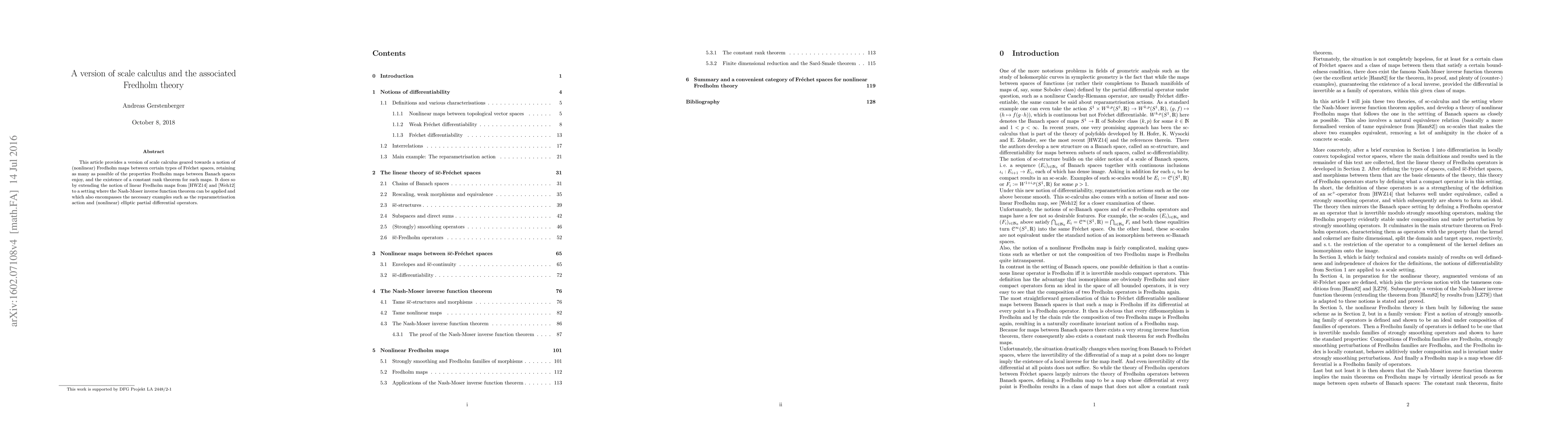 This paper presents a version of scale calculus for nonlinear Fredholm maps between Frechet spaces, extending linear Fredholm theory to include the Nash-Moser inverse function theorem and encompassing examples like reparametrisation actions and nonlinear elliptic PDEs. It aims to retain as many properties of Fredholm maps as possible while establishing a constant rank theorem.