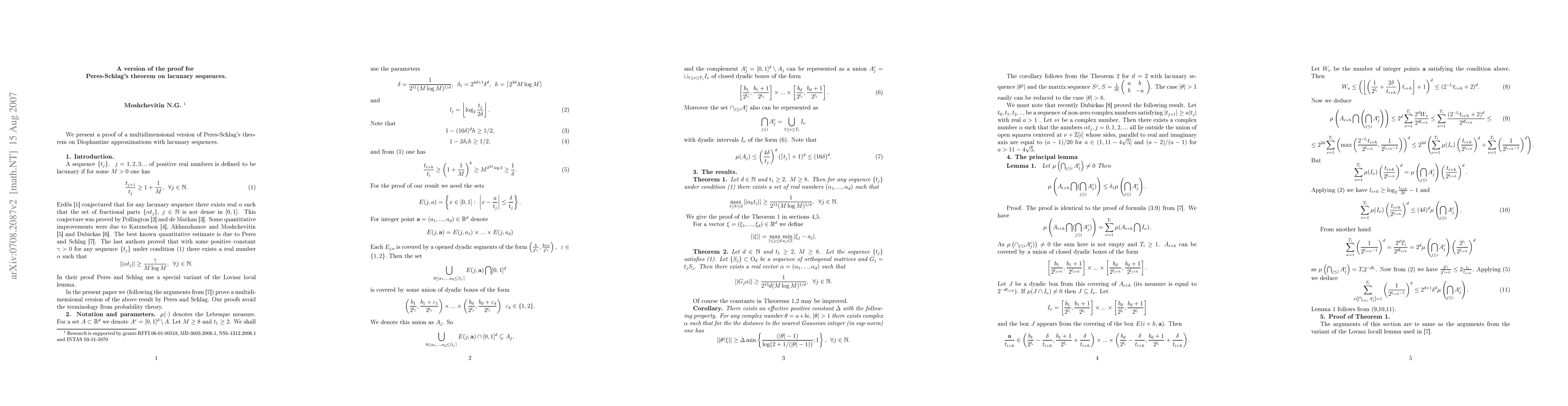 Summary: This paper provides a proof for a multidimensional extension of Peres-Schlag's theorem concerning Diophantine approximations using lacunary sequences. The focus is on demonstrating the effectiveness of these sequences in approximating points in higher-dimensional spaces.