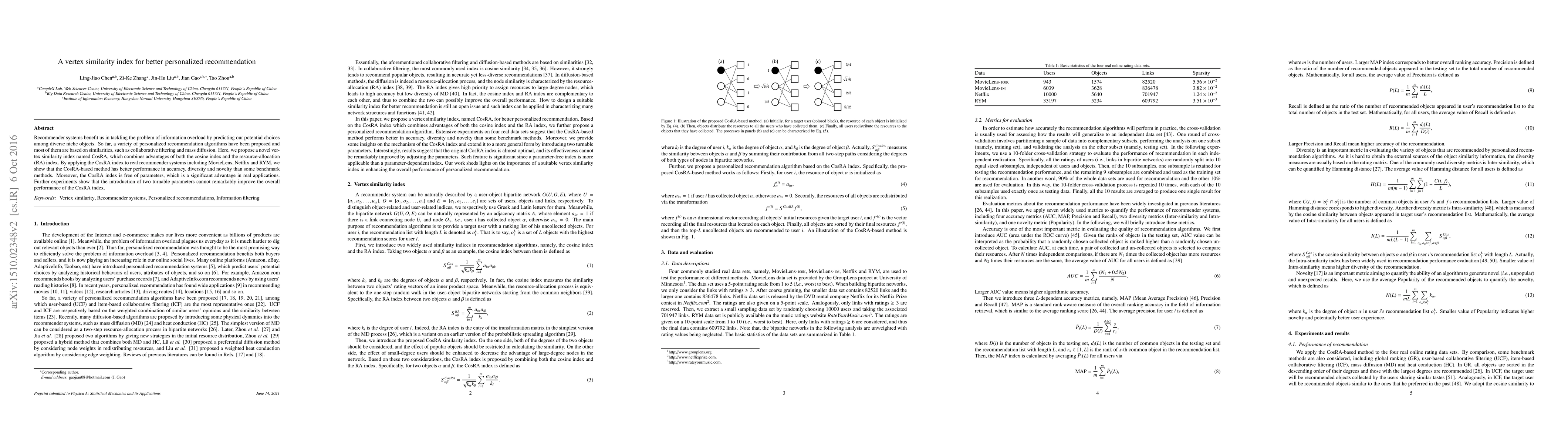This paper proposes a novel vertex similarity index called CosRA, which integrates cosine and resource-allocation indices to enhance personalized recommendation systems. Experiments on MovieLens, Netflix, and RYM show that the CosRA index outperforms benchmark methods in accuracy, diversity, and novelty, and it remains parameter-free, which simplifies real-world applications.