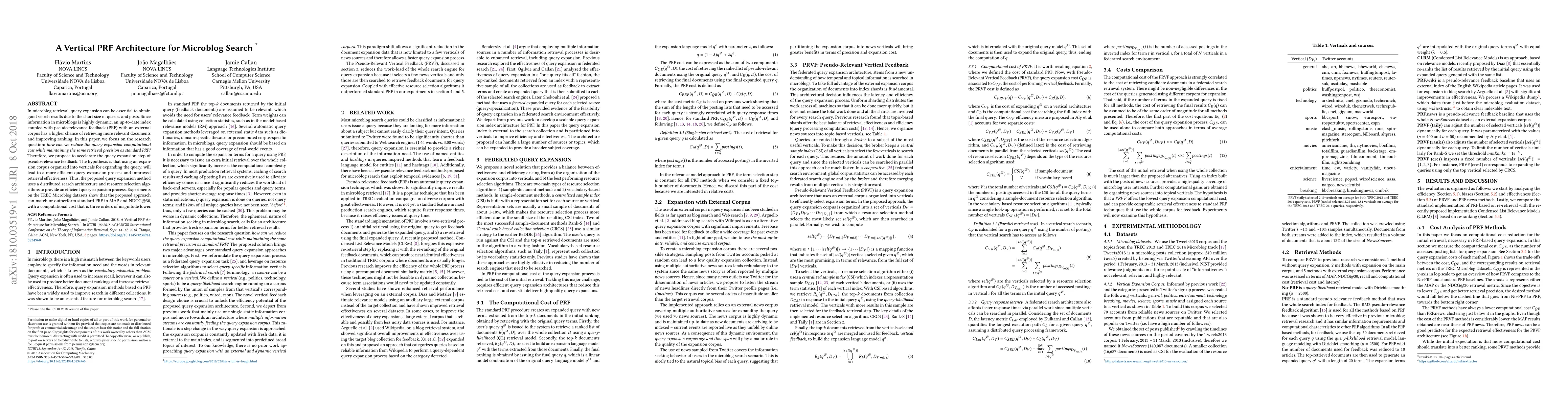 This paper proposes a vertical PRF architecture for microblog search that aims to reduce computational costs while maintaining retrieval precision. By organizing an expansion corpus into verticals and employing a distributed search architecture, the method achieves significant efficiency gains, matching or exceeding standard PRF performance in terms of MAP and NDCG@30.