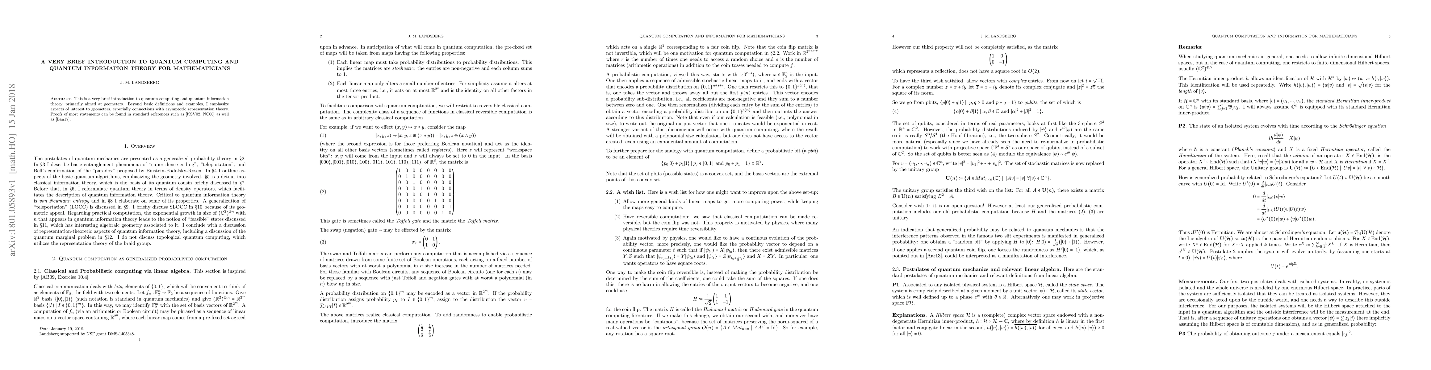 This is a very brief introduction to quantum computing and quantum information theory, primarily aimed at geometers. Beyond basic definitions and examples, I emphasize aspects of interest to geometers, especially connections with asymptotic representation theory. Proofs of most statements can be found in standard references.
