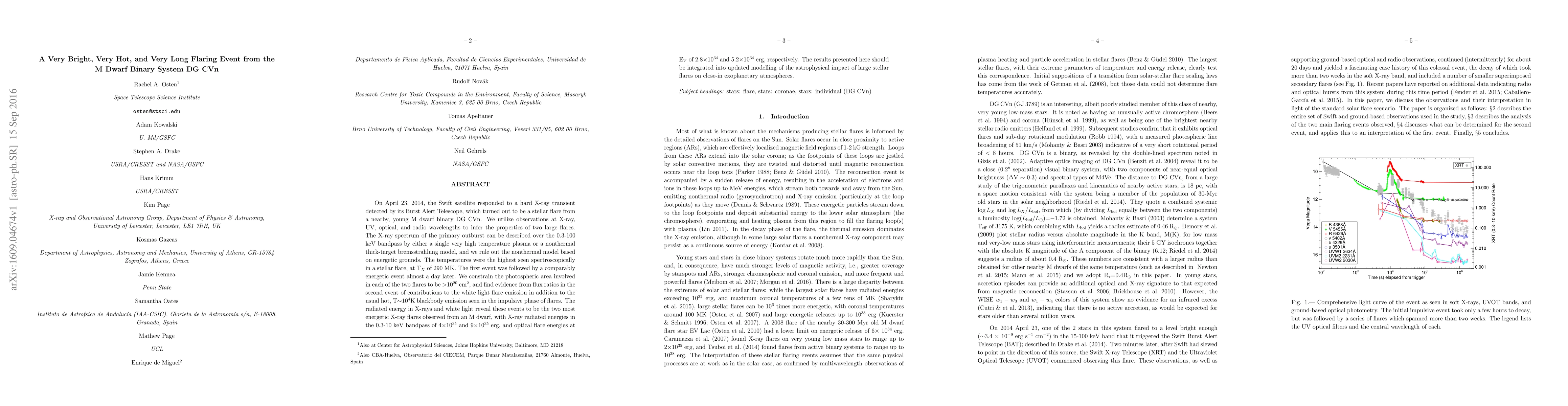 On April 23, 2014, the Swift satellite responded to a hard X-ray transient detected by its Burst Alert Telescope, which turned out to be a stellar flare from a nearby, young M dwarf binary DG~CVn. We utilize observations at X-ray, UV, optical, and radio wavelengths to infer the properties of two large flares. The X-ray spectrum of the primary outburst can be described over the 0.3-100 keV bandpass by either a single very high temperature plasma or a nonthermal thick-target bremsstrahlung model, and we rule out the nonthermal model based on energetic grounds. The temperatures were the highest seen spectroscopically in a stellar flare, at T$_{X}$ of 290 MK. The first event was followed by a comparably energetic event almost a day later. We constrain the photospheric area involved in each of the two flares to be $>$10$^{20}$ cm$^{2}$, and find evidence from flux ratios in the second event of contributions to the white light flare emission in addition to the usual hot, T$\sim$10$^{4}$K blackbody emission seen in the impulsive phase of flares. The radiated energy in X-rays and white light reveal these events to be the two most energetic X-ray flares observed from an M dwarf, with X-ray radiated energies in the 0.3-10 keV bandpass of 4$\times$10$^{35}$ and 9$\times$10$^{35}$ erg, and optical flare energies at E$_{V}$ of 2.8$\times$10$^{34}$ and 5.2$\times$10$^{34}$ erg, respectively. The results presented here should be integrated into updated modelling of the astrophysical impact of large stellar flares on close-in exoplanetary atmospheres.